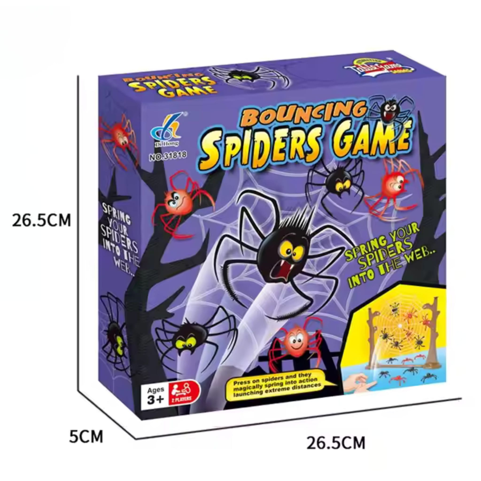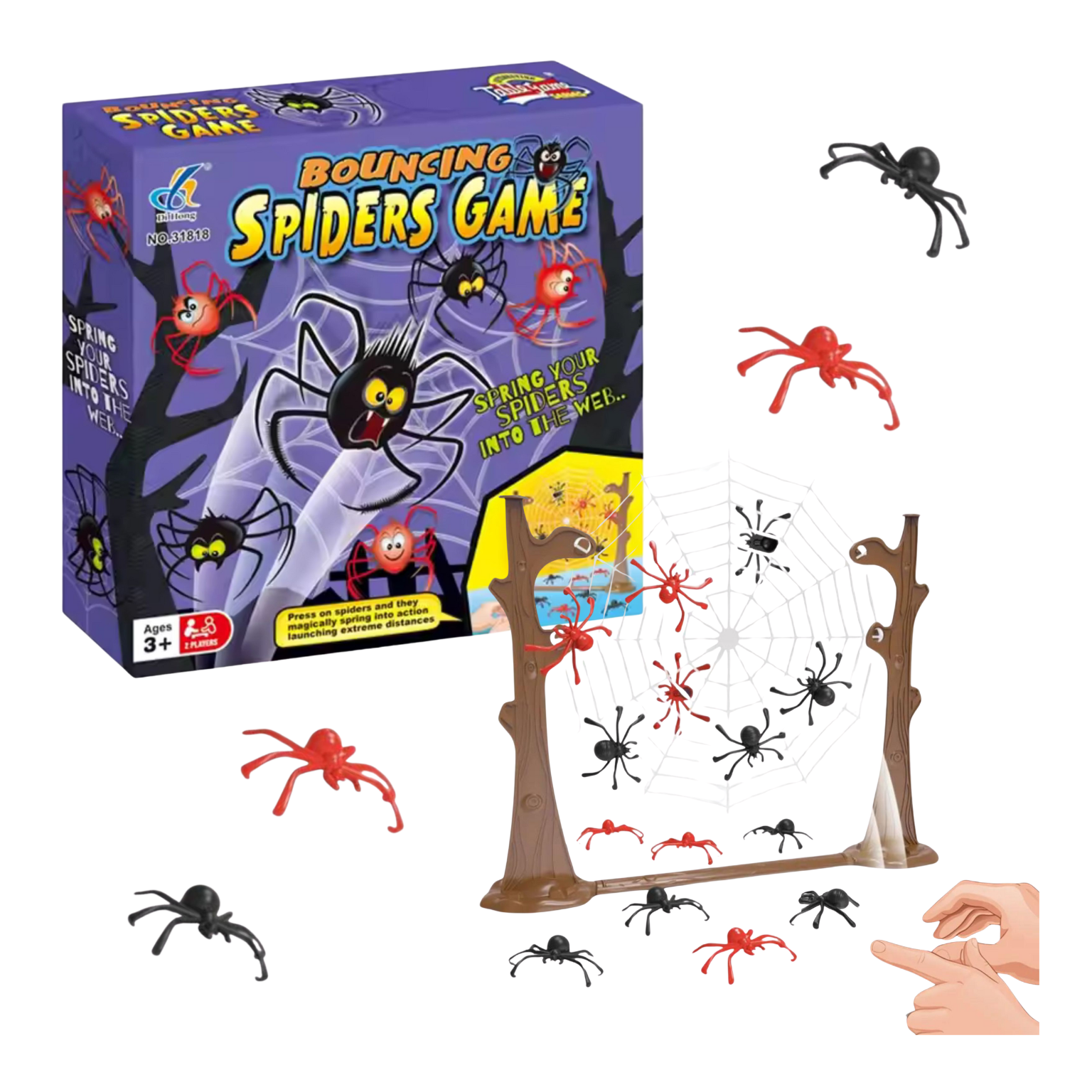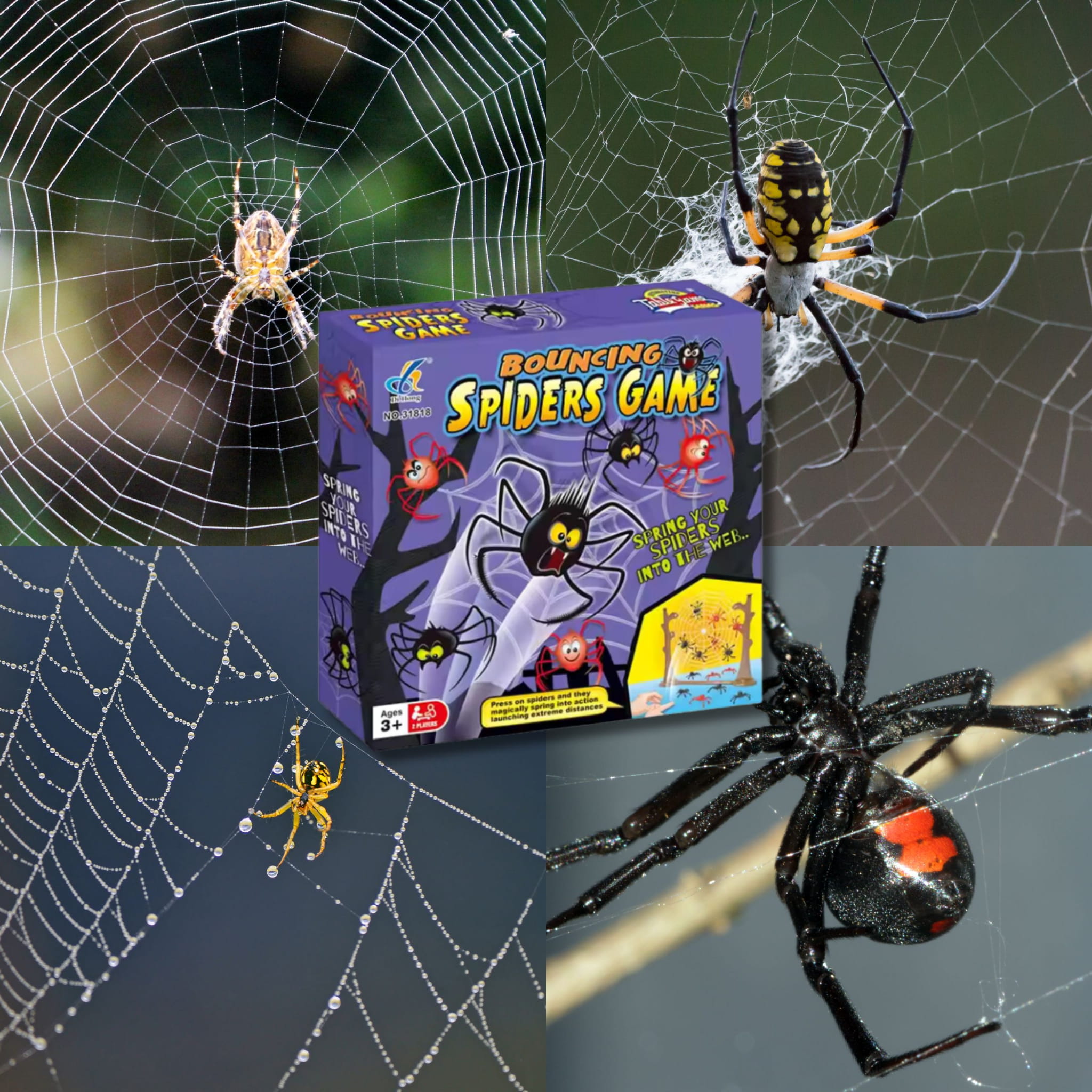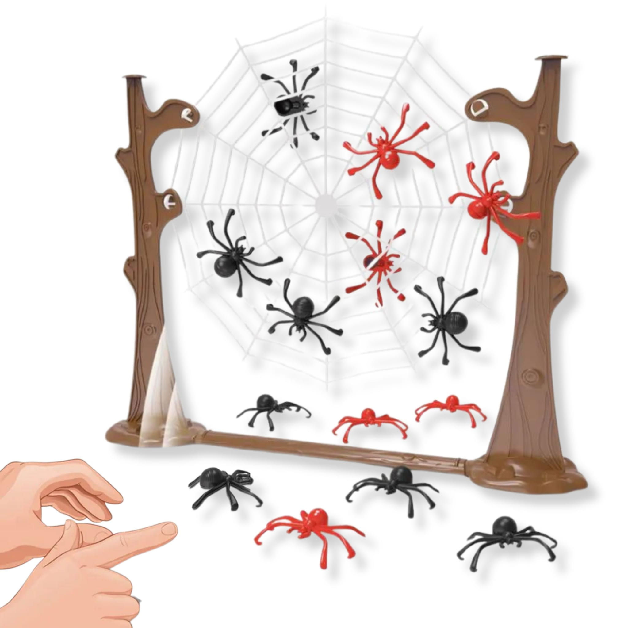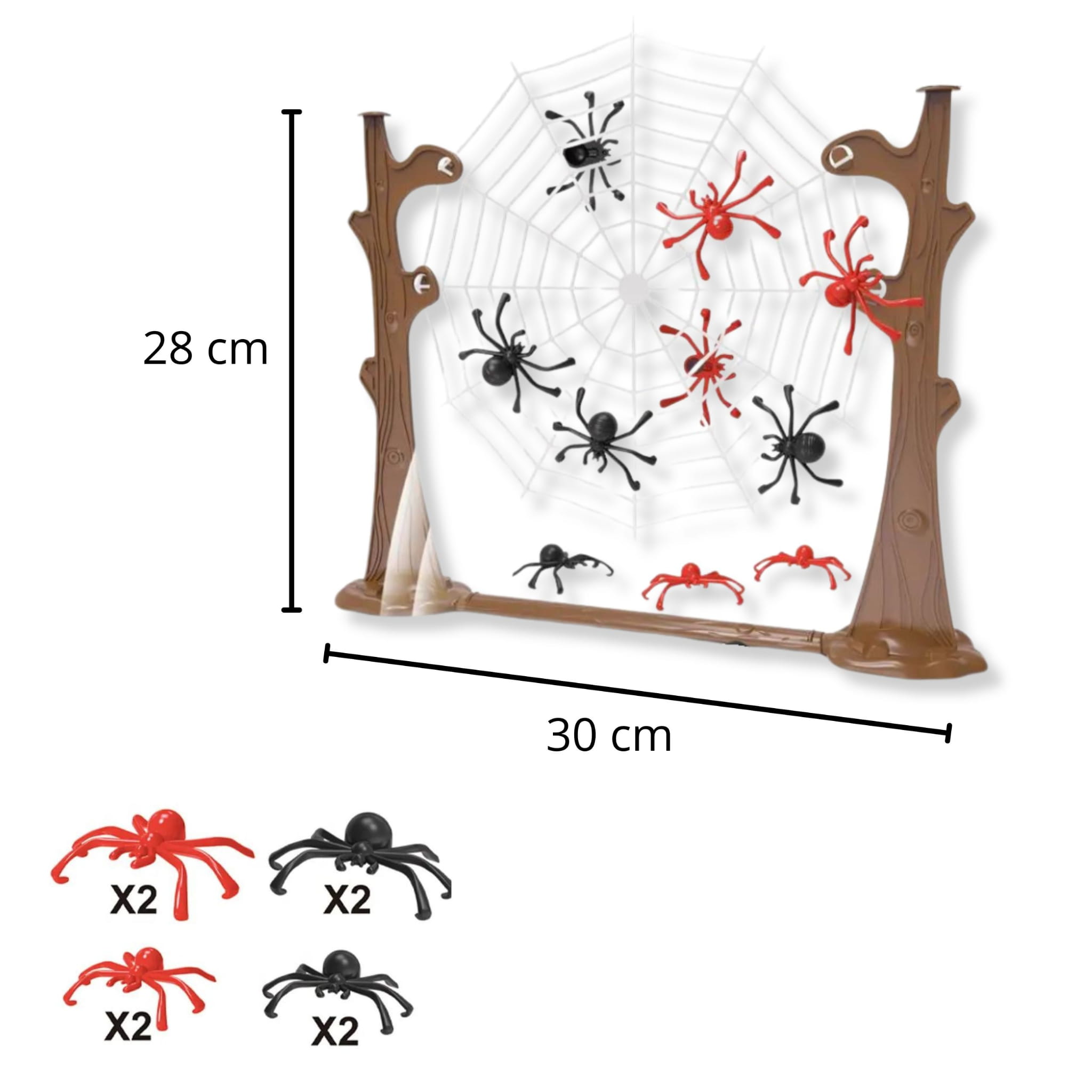 - Zestaw zawiera: 8 pająków w dwóch kolorach i rozmiarach, Pajęczą sieć do gry (papierowa), stelaż do zawieszanie sieci.