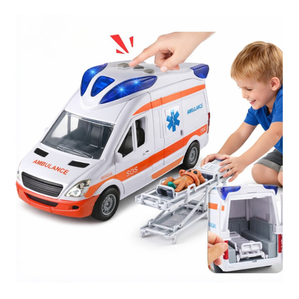 Prawdziwa karetka pogotowia nie może poruszać się bez odpowiedniej sygnalizacji. Oferowany model posiada na dachu wbudowany panel elektroniczny, który generuje intensywne efekty świetlne imitujące profesjonalne koguty ostrzegawcze. Cztery dedykowane przyciski pozwalają na aktywację różnych rodzajów dźwięków, w tym odgłosu odpalania silnika, ostrzegawczego klaksonu, dźwięku cofania oraz charakterystycznej syreny alarmowej. Samochód lekarski został również wyposażony w niezawodny napęd frykcyjny (friction) na przednią oś – wystarczy pchnąć pojazd po gładkiej powierzchni, aby dynamicznie ruszył przed siebie.