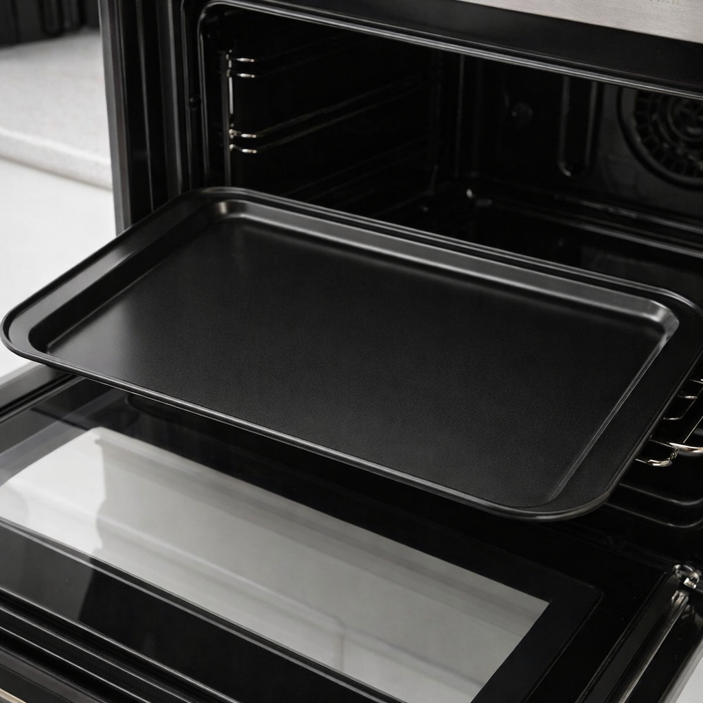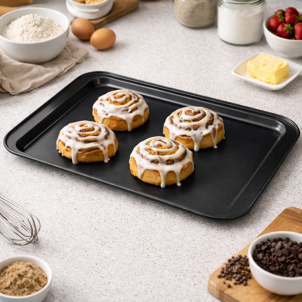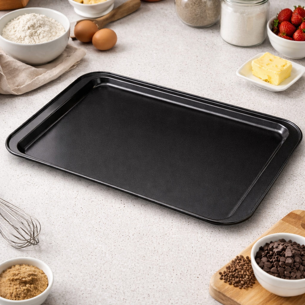 Blacha wykonana jest z trwałej stali węglowej, która dobrze przewodzi ciepło i wspiera równomierne pieczenie na całej powierzchni. Powłoka nieprzywierająca non-stick ogranicza przyklejanie się ciasta, dzięki czemu łatwiej zdjąć wypiek i szybciej umyć formę po użyciu.
