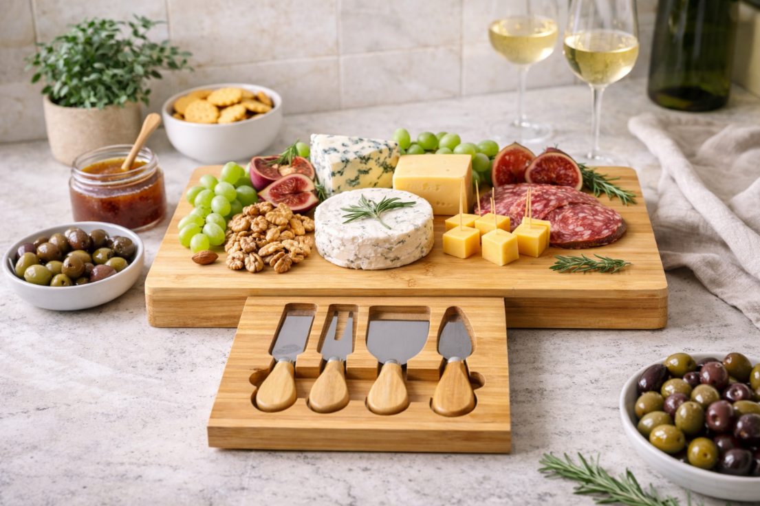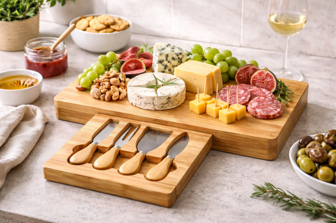 To akcesorium kuchenne, które ułatwia organizację w domu: masz pod ręką solidną deskę do krojenia i komplet noży do serów, dzięki czemu przygotowanie przekąsek jest po prostu wygodniejsze.
