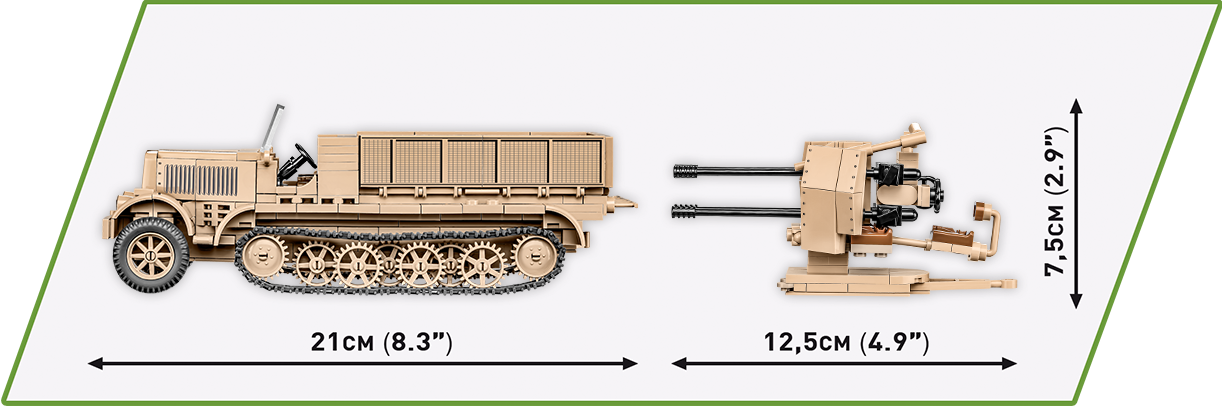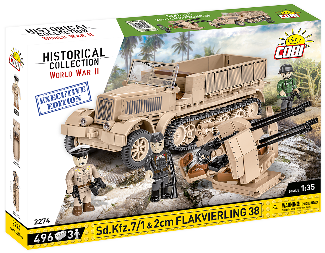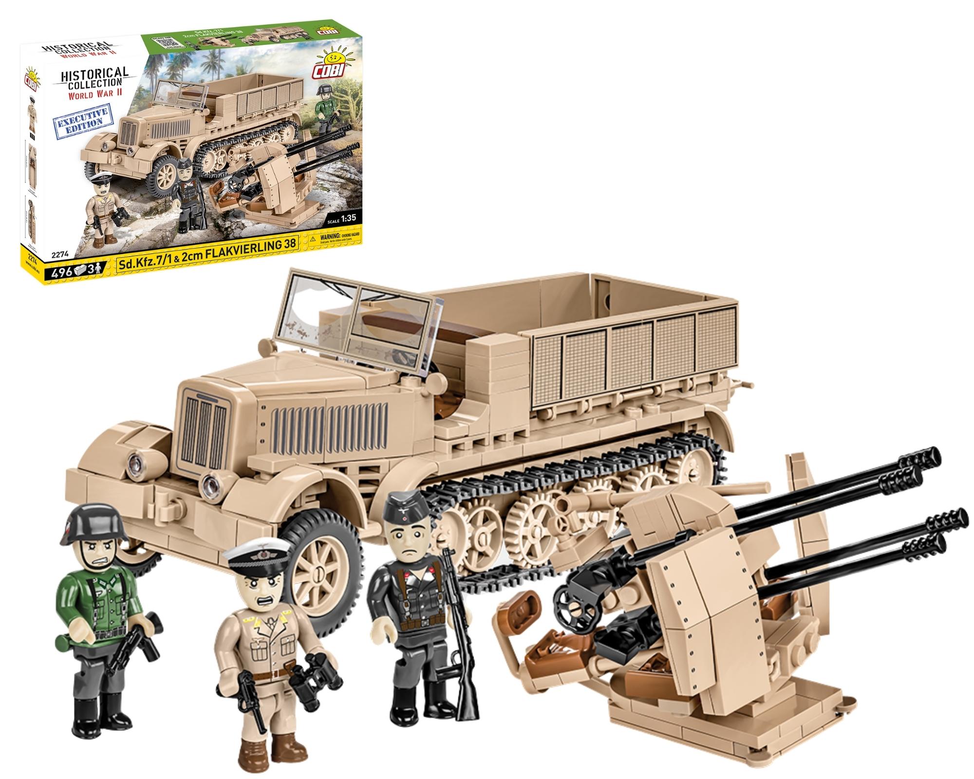 ✅ Po raz pierwszy zestaw EXECUTIVE EDITION oprócz atrakcyjnych dodatków został wydany w innym kolorze niż wersja podstawowa Sd.Kfz.7 (COBI-2275).Piaskowy kolor, zmieniona konstrukcja pojazdu dostosowana do przewożenia poczwórnego działa przeciwlotniczego 2cm Flakvierling 38, dodatkowa figurka oficera Afrika Korps i jeszcze więcej ciekawych nadruków to cechy odróżniające EXECUTIVE EDITION od wersji standardowej! Sd.Kfz.7 był produkowany przez przemysł niemiecki w wielu wersjach. Zestaw COBI to świetna baza do dalszych fanowskich modyfikacji!