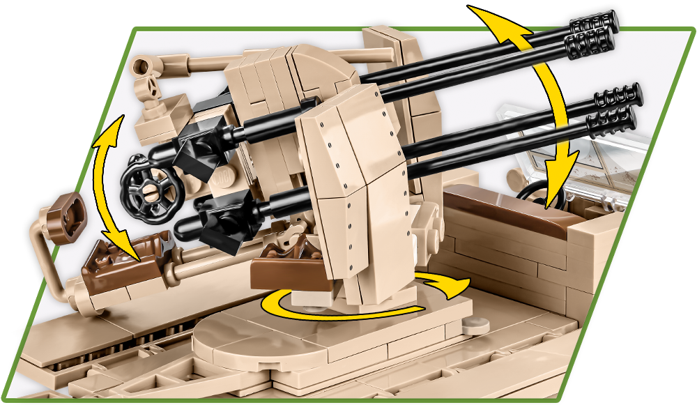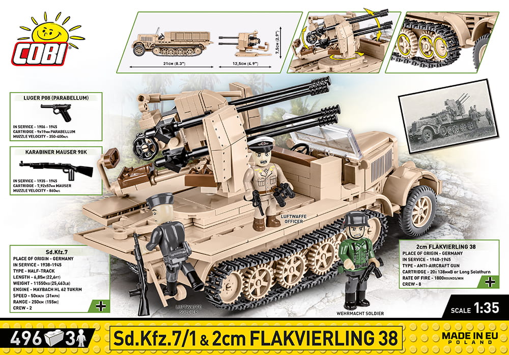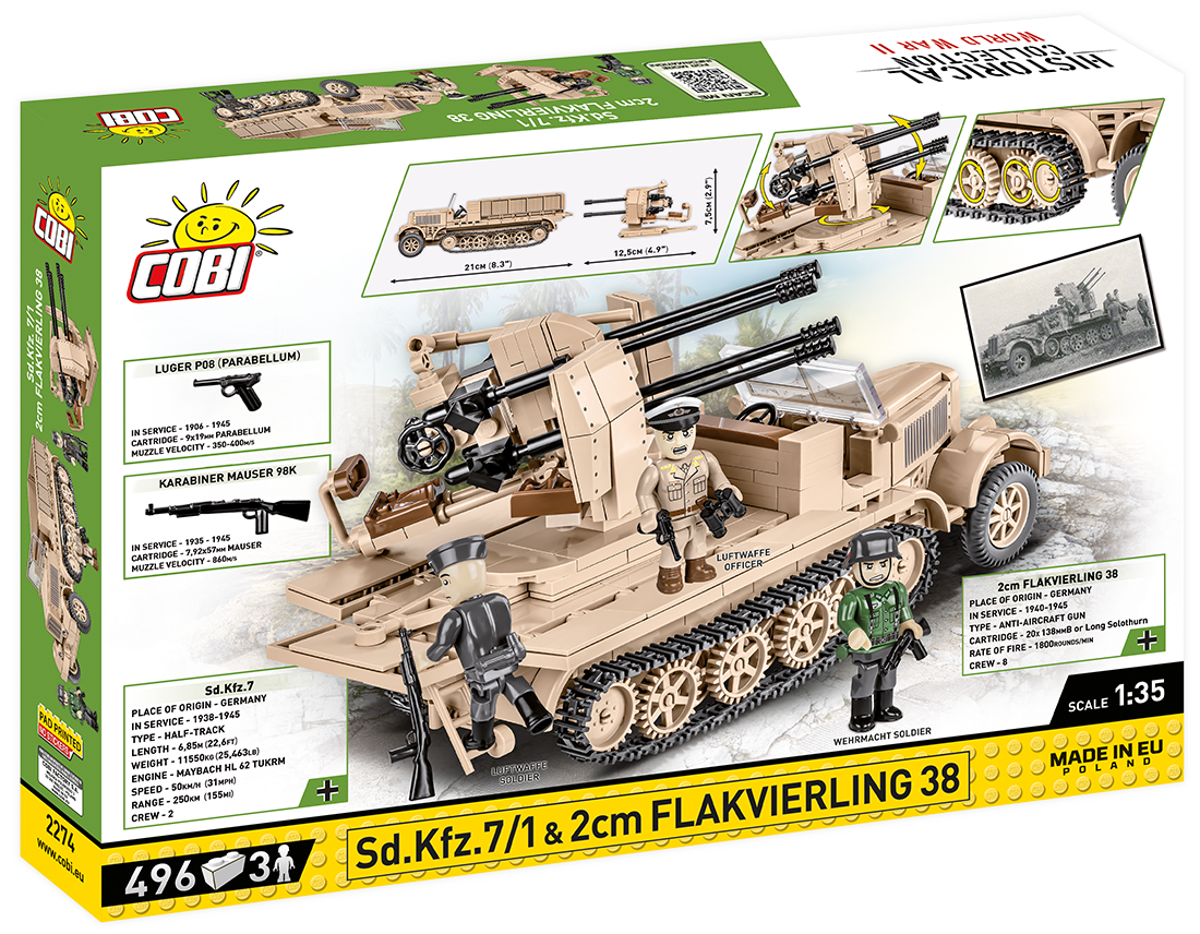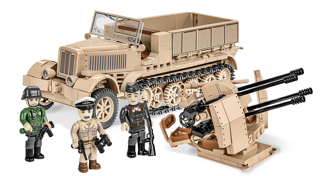 Na pace znajduje się bardzo popularne niemieckie działo przeciwlotnicze 2cm Flakvierling 38, które można ustawić również obok pojazdu! Zestaw doskonale uzupełnia rozwijającą się kolekcję klockowych, historycznych pojazdów wydawanych w skali 1:35. Z pewnością znajdzie miejsce w Twojej kolekcji obok ciężarówek Blitz, samochodów Horch i innych niesamowitych pojazdów wydanych w tej samej serii i skali przez COBI.