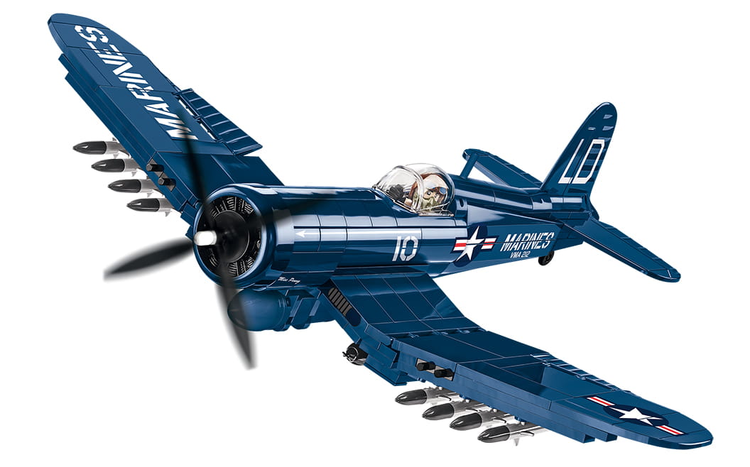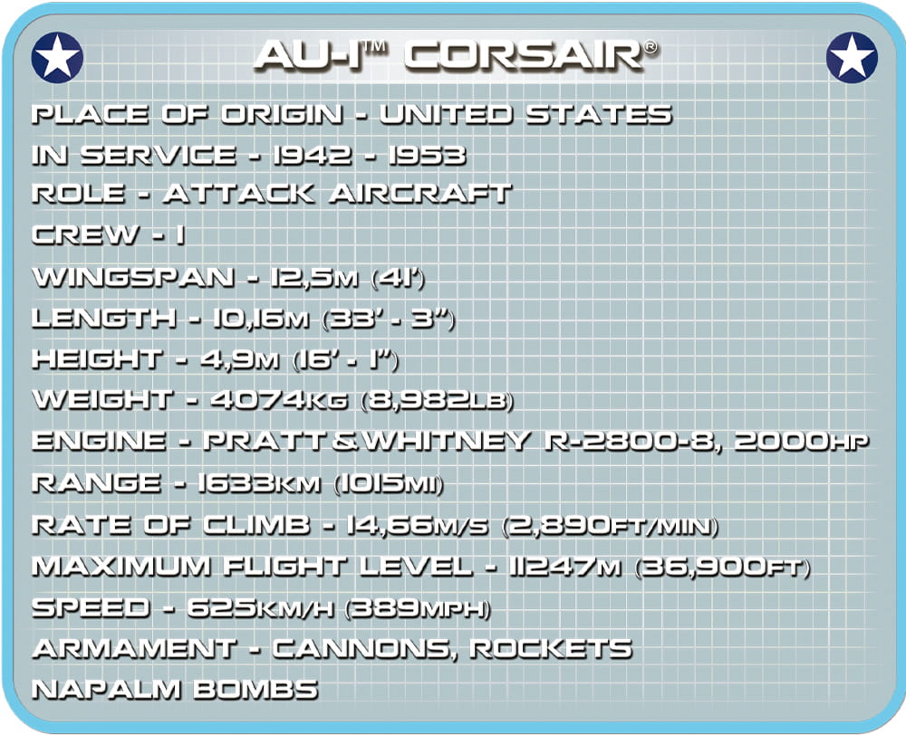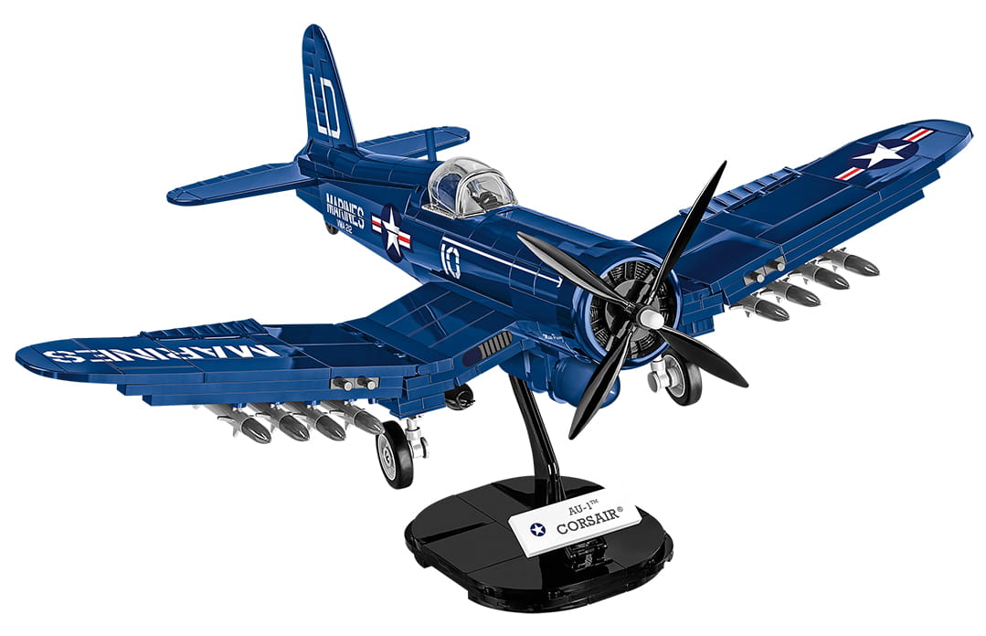 Zestaw został opracowany na licencji amerykańskiego mega koncernu technologiczno obronnego Northrop Grumman. Pudełko z AU-1™ Corsair® zawiera 330 elementów i jedną figurkę pilota. Model samolotu myśliwskiego od firmy COBI został stworzony z dbałością o najdrobniejsze detale.