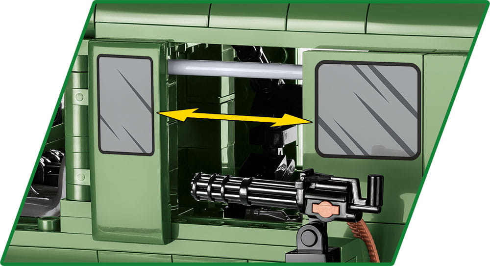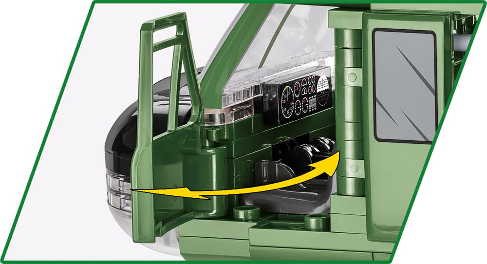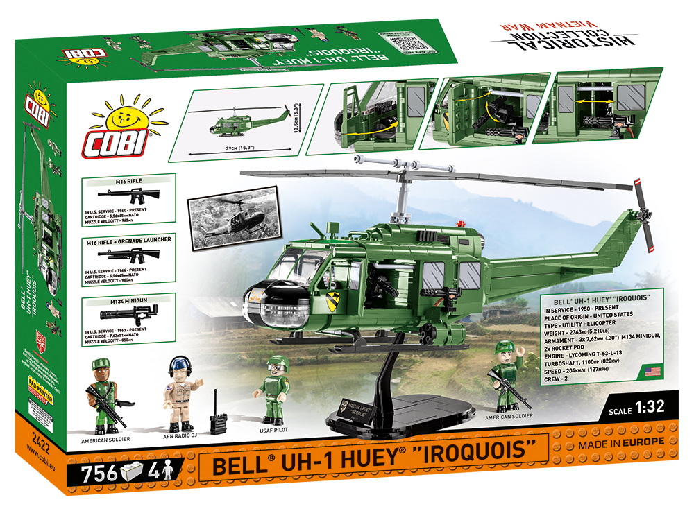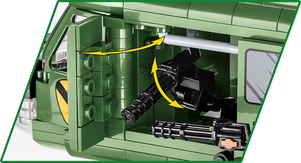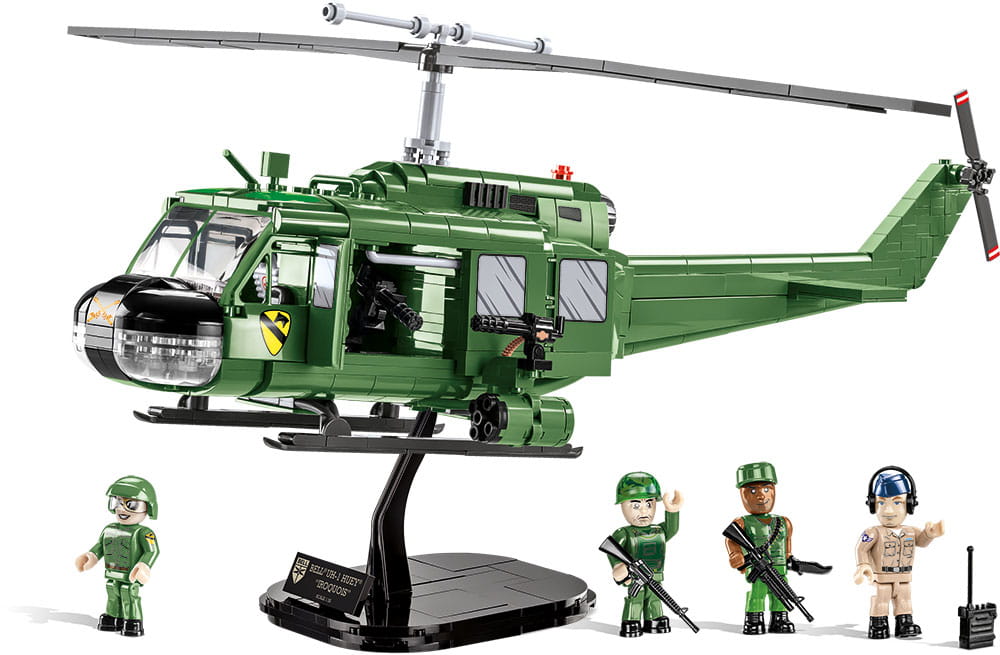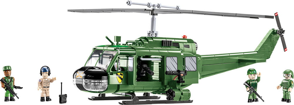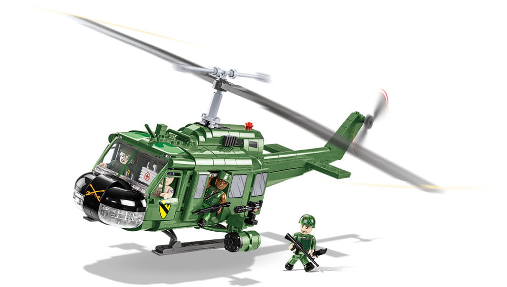 Z zestawu klocków konstrukcyjnych COBI wybudujesz dokładnie odwzorowany w skali 1:32 niezwykle popularny amerykański śmigłowiec Huey. Zestaw został wydany w serii Vietnam War na licencji amerykańskiego producenta komercyjnych i militarnych śmigłowców Bell Helicopter Textron. Mierzący aż 39 cm długości model został pokryty wysokiej jakości nadrukami, które nie zużywają się nawet w czasie intensywnego użytkowania. Nadruki są charakterystyczne dla kawalerii powietrznej USA oraz imitują detale oporządzenia. Helikopter został wyposażony obracające się śmigła, przesuwne drzwi i karabin maszynowy chowany do środka.