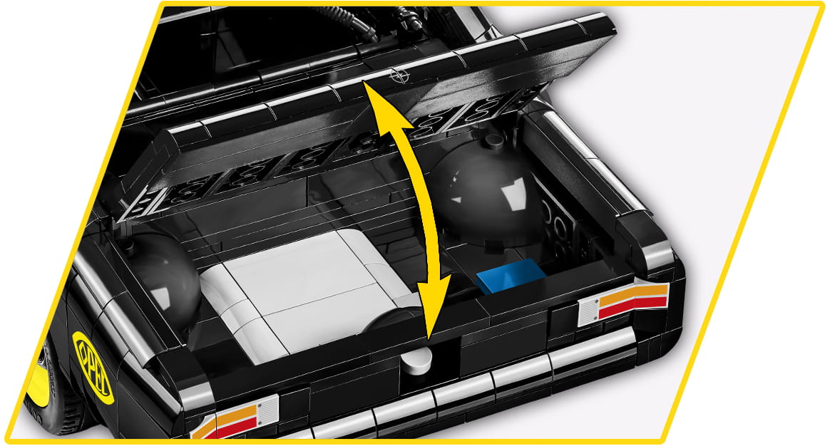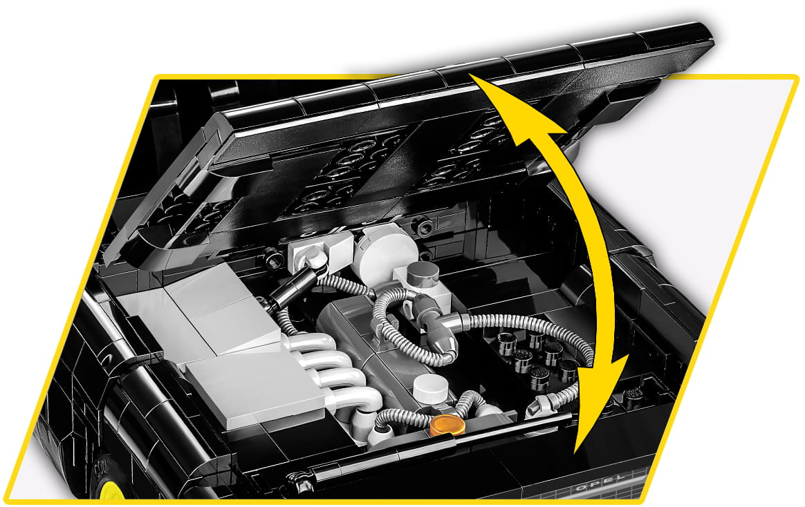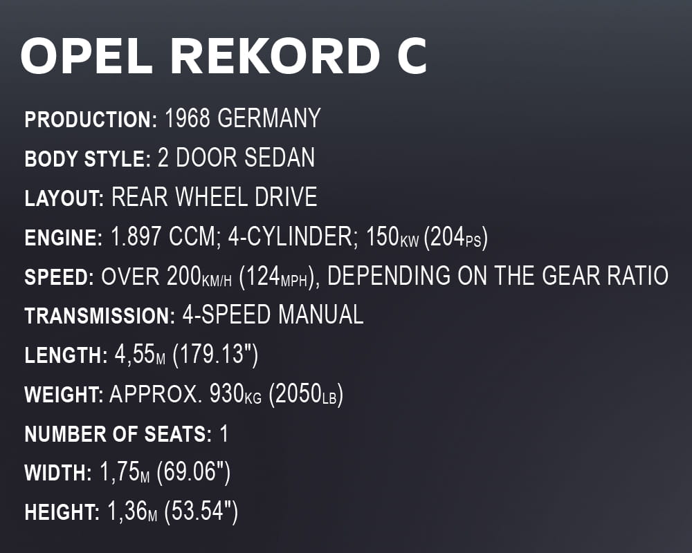 Opel to niemiecki producent samochodów osobowych, sportowych i dostawczych, który za sprawą wielu udanych modeli na trwałe zapisał się w historii motoryzacji. Przełomowym samochodem, dla Opla, który w segmencie klasy średniej po raz pierwszy przekroczył milion wyprodukowanych egzemplarzy, był właśnie REKORD. Najsłynniejszy Opel Rekord ""Schwarze Witwe"" powstał w tajemnicy! Jako część koncernu General Motors, Opel miał zakaz działalności wyścigowej. Mimo to pracownicy fabryki przygotowali sportową wersję Rekorda ze 180 konnym silnikiem. Dzięki żółtym aplikacjom na czarnym lakierze nazywano go ""Wyścigową Taksówką"" i ""Czarną Wdową"". Samochód stał się sensacją i brał udział w spektakularnych wyścigach. Na skutek zakazów z kierownictwa GM samochód został wywieziony do Austrii, gdzie ślad po nim zaginął. Teraz za sprawą klocków konstrukcyjnych COBI, legenda motoryzacji powraca w wielkim stylu!