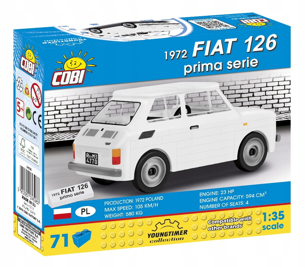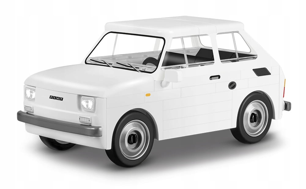 Model w skali 1:35 złożony w 100% z klocków COBI bardzo wiernie oddaje charakterystyczne kształty oryginalnego Fiata 126. Dzięki 71 elementom możliwe są drobne modyfikacje i przeróbki pojazdu. W modelu tym zrezygnowaliśmy z naklejek. Zostały one zastąpione trwałymi nadrukami, które nie ścierają się nawet w trakcie intensywnej zabawy. Obracające się koła wyposażone w opony idealnie nadają się do poruszania modelem w trakcie zabawy. W ofercie COBI znajdują się również polskie wersje Fiata w tym edycja z kultową przyczepą Niewiadów.