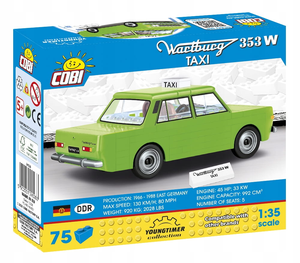 Samochód osobowy Wartburg 353 produkowany w Niemieckiej Republice Demokratycznej był jak na swoje czasy autem eleganckim i nowoczesnym. Do dziś wielu kierowców z rozrzewnieniem wspomina jego dość charakterystyczny dźwięk pracującego silnika. Pomimo upływu wielu lat od zakończenia produkcji, na zlotach fanów motoryzacji można spotkać wiele wypielęgnowanych i zachowanych w idealnym stanie egzemplarzy tego wehikułu. Jasnozielony Wartburg w wersji TAXI z pewnością stanie się ciekawym uzupełnieniem kolekcji COBI Youngtimer!