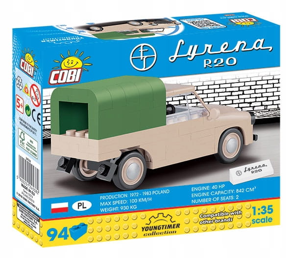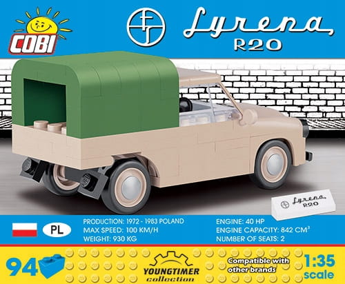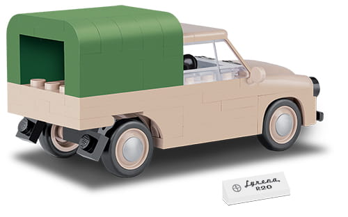 Klockowy model COBI w skali 1:35 zbudowany jest częściowo ze specjalnych elementów, które zostały zaprojektowane specjalnie po to, by wiernie odwzorować klasyczne kształty karoserii tego wyjątkowego pojazdu. Miniaturowa Syrena R20 posiada ruchome koła z gumowymi oponami. Jej solidna budowa pozwala również na zabawę także najmłodszym fanom klocków.