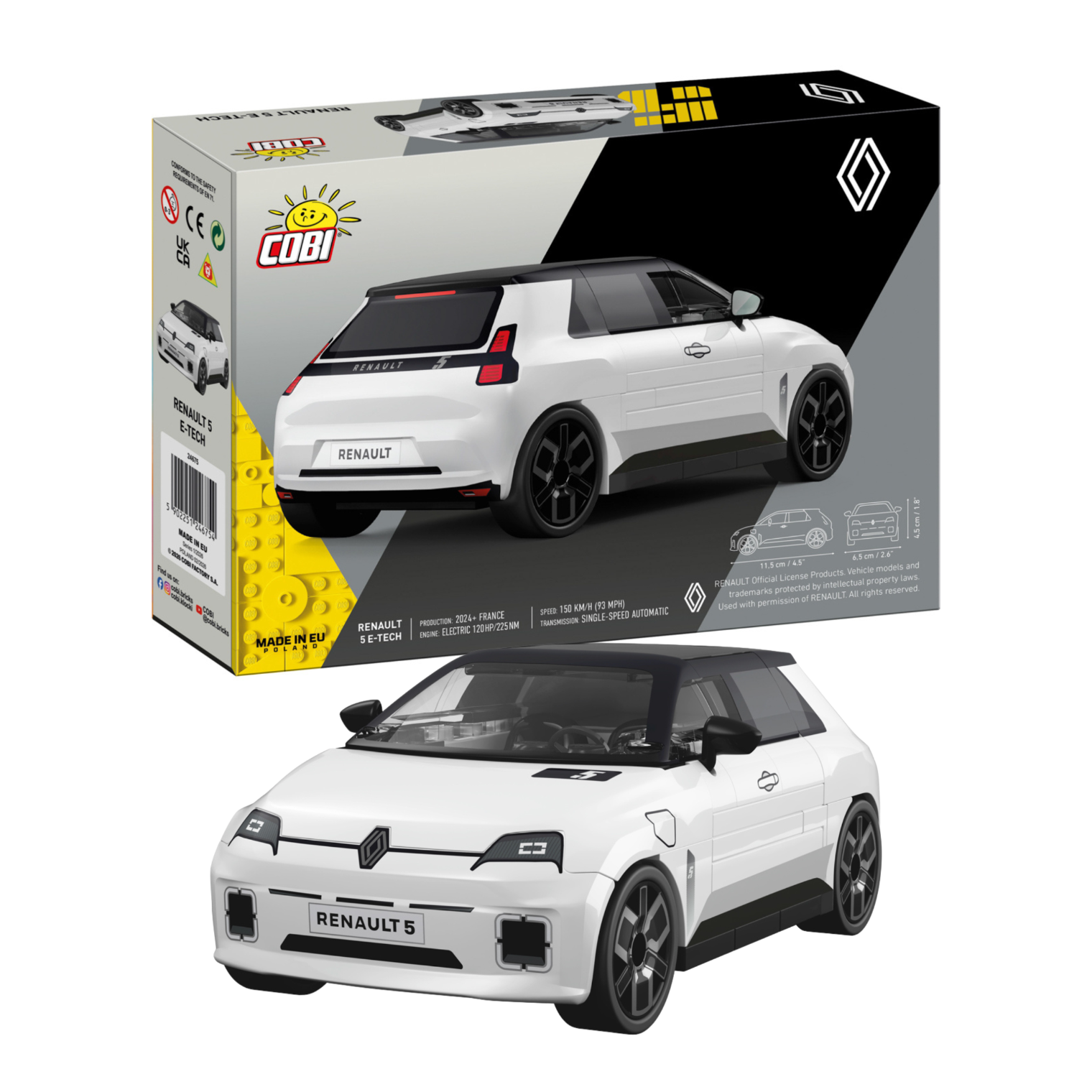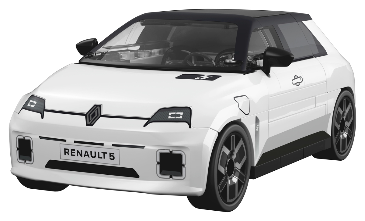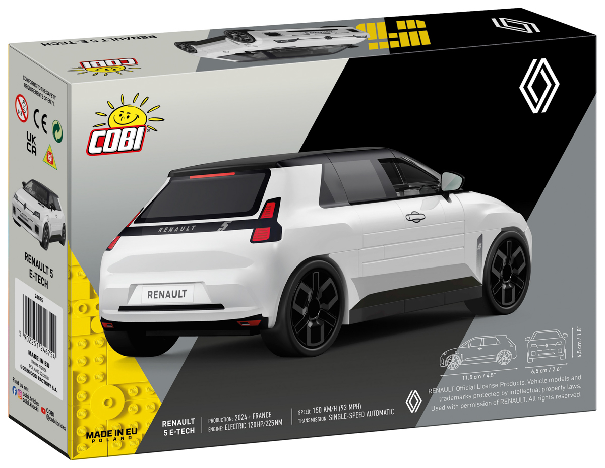 Model został zaprojektowany w skali 1:35 i składa się z 78 precyzyjnie dopasowanych elementów. Bryła samochodu wiernie oddaje charakterystyczne proporcje Renault 5 E-Tech, jego nowoczesną stylistykę oraz eleganckie białe wykończenie.