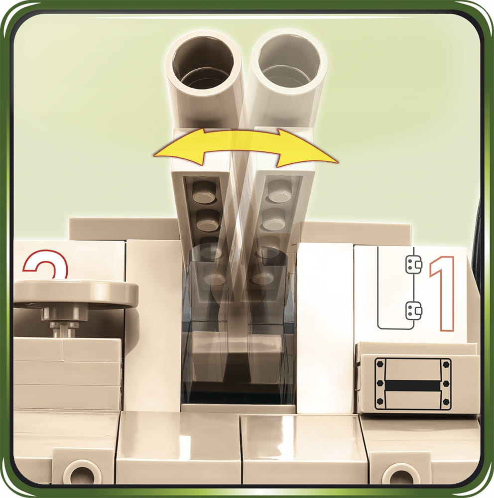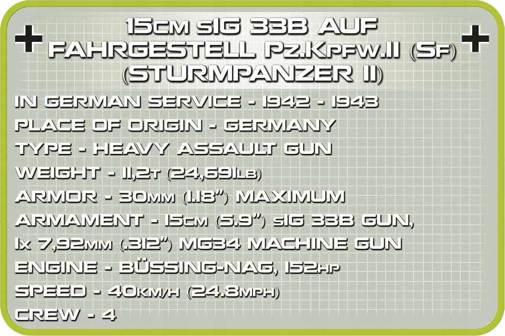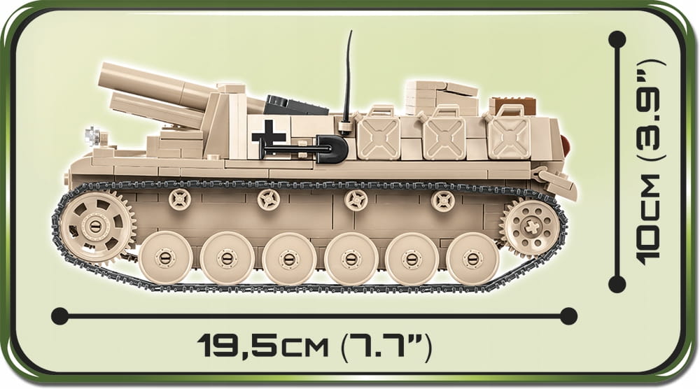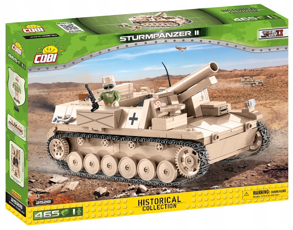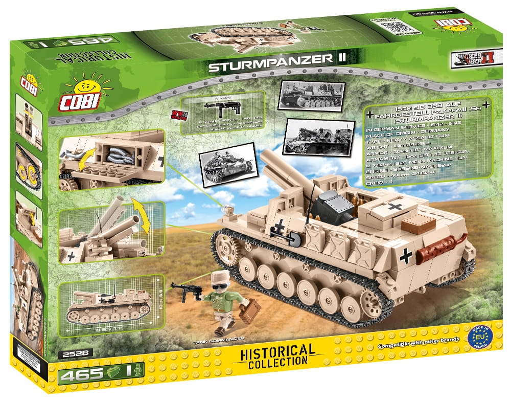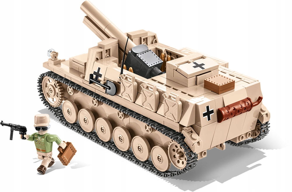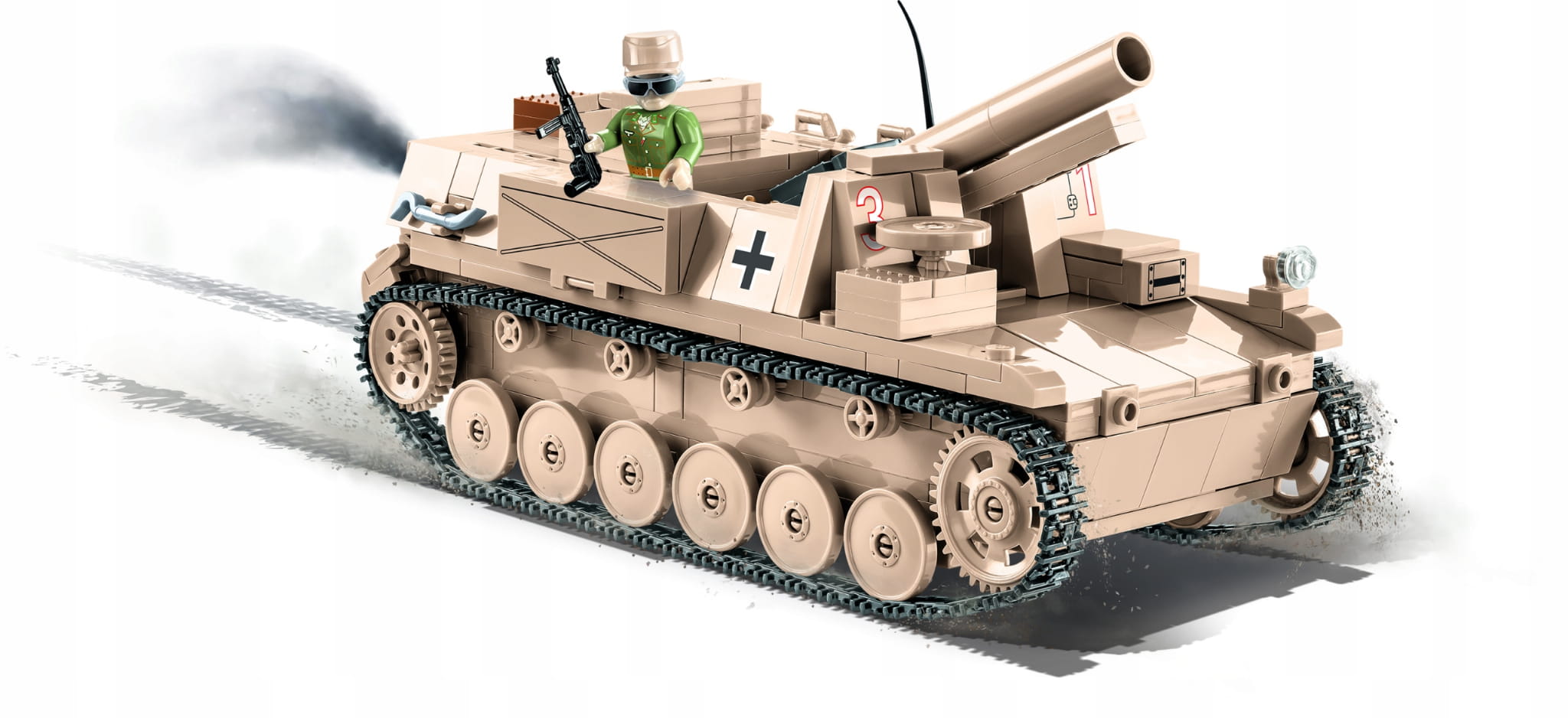 Z zestawu klocków konstrukcyjnych COBI wybudujesz niemieckie działo samobieżne Sturmpanzer II. Klockowy model został odwzorowany z największą dbałością o szczegóły. Pojazd został pokryty wysokiej jakości nadrukami, które nie ścierają się nawet w trakcie intensywnej zabawy. W tym zestawie całkowicie zrezygnowano z naklejek. Nadruki odwzorowują malowanie działa samobieżnego, jakie było wykorzystywane podczas działań wojennych w Afryce Północnej. Model posiada ruchome koła oraz gąsienice. Lufą działa również można poruszać. Otwierane skrzynki i schowki oraz dołączone akcesoria w postaci łopatki i łomu uatrakcyjniają zabawę.