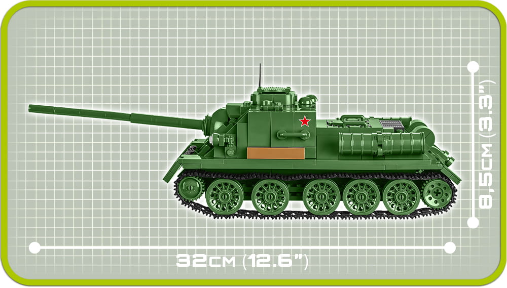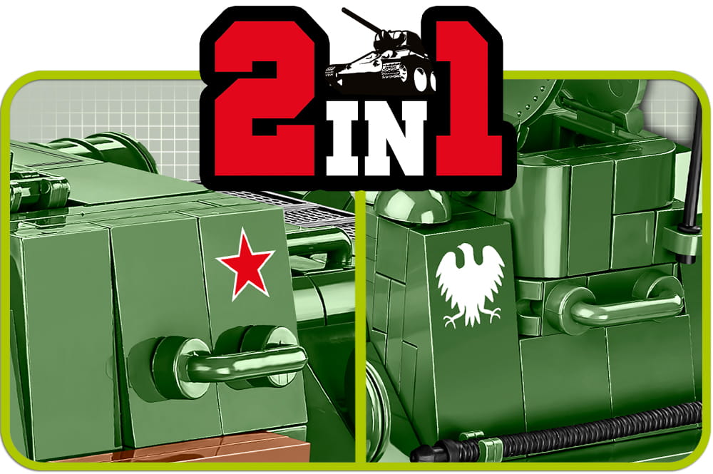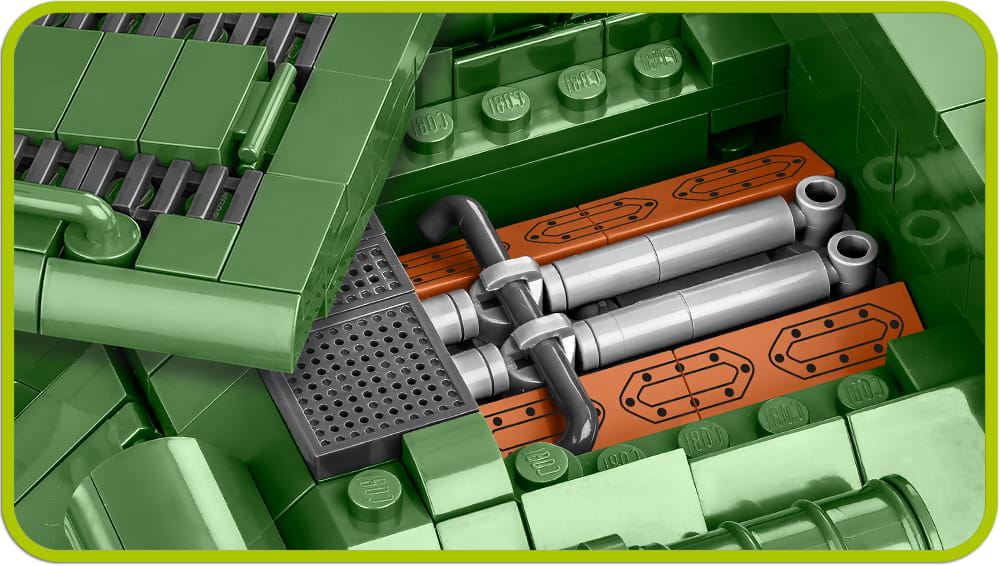 Model działa samobieżnego SU-100 został w całości zaprojektowany z klocków konstrukcyjnych COBI. Zastosowanie aż 655 klocków umożliwiło wiernie odwzorowanie tego pojazdu. Zestaw nie zawiera naklejek. Klocki zostały pokryte wysokiej jakości nadrukami, które nie ścierają się nawet w trakcie intensywnego użytkowania. Model został wyposażony w sprawną trakcję gąsienicową, ruchome działo i otwierane włazy. Pod klapą serwisową znajduje się atrakcyjnie wyglądająca atrapa silnika. Do zestawu dołączone są klocki z oznaczeniami radzieckimi i polskimi do wyboru. Całość uzupełnia figurka żołnierza z karabinem Mosin, czapką uszanką i czerwonym sztandarem. W czytelnej instrukcji zamieszczony jest spis klocków oraz statystyki, które możesz wykorzystać w darmowej Historycznej Grze Bitewnej COBI.