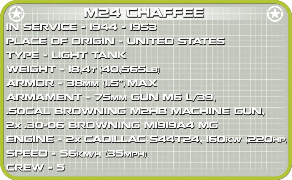 Z zestawu 590 klocków konstrukcyjnych COBI wybudujesz doskonale odwzorowany model czołgu lekkiego M24 Chaffee. Model posiada działającą trakcję gąsienicową, obracającą się wieżę i ruchomą lufę. Pod otwieraną klapą serwisową znajdziemy atrapy dwóch silników. Na wieży znajduje się otwierany właz oraz karabin maszynowy. Na modelu znajdziemy trwałe nadruki, które nie ścierają się nawet podczas intensywnej zabawy.