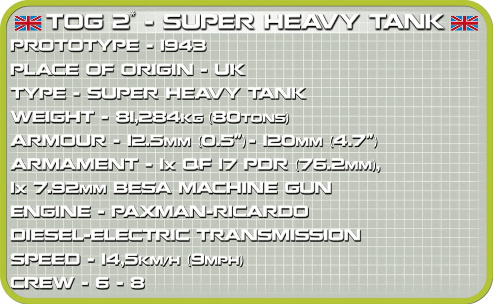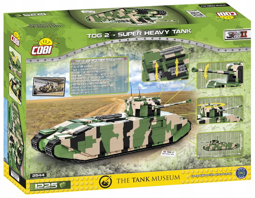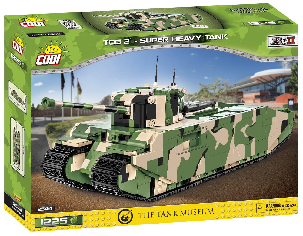Zestaw TOG 2 powstał we współpracy COBI z Bovington Tank Museum. Model składa się z 1225 wysokiej jakości klocków konstrukcyjnych COBI i mierzy aż 41 cm długości. Charakterystyczny kamuflaż został odwzorowany za pomocą kolorowych klocków oraz trwałych nadruków, które nie ścierają się nawet w trakcie intensywnego użytkowania. Czołg został wyposażony w obrotową wieżę, ruchomą lufę oraz atrapę silnika znajdującą się pod uchylną klapą serwisową. Działająca trakcja gąsienicowa umożliwia poruszanie pojazdem np. po biurku lub podłodze.