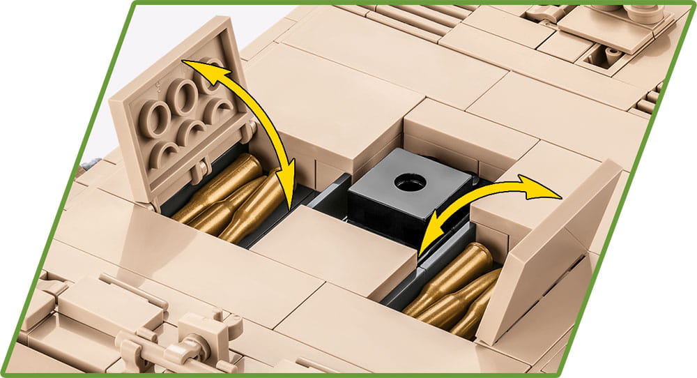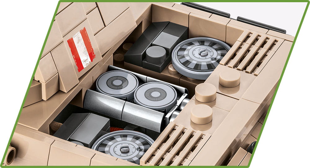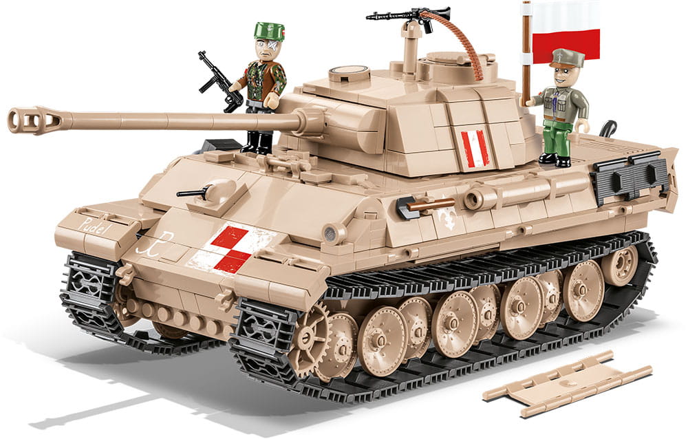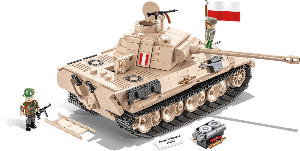 Czołg Pantera “Pudel” został zaprojektowany z klocków konstrukcyjnych COBI w skali 1:28 przy wykorzystaniu aż 840 elementów! Model zawiera ruchome elementy takie jak obracająca się wieża, ruchoma armata, działająca trakcja gąsienicowa. Włazy w czołgu można otworzyć i umieścić w nich klockową załogę. Pod klapą serwisową znajduje się odwzorowany z klocków silnik. Wiele wysokiej jakości nadruków odtwarza wyjątkowe malowanie powstańczego czołgu. Do zestawu dołączono figurkę harcerza z “Szarych Szeregów” trzymającego nową polską flagę. Figurka przedstawiająca żołnierza z batalionu Parasol również zawiera nowe nadruki w tym emblemat formacji. Zestaw uzupełnia tabliczka z nadrukowaną nazwą zestawu.