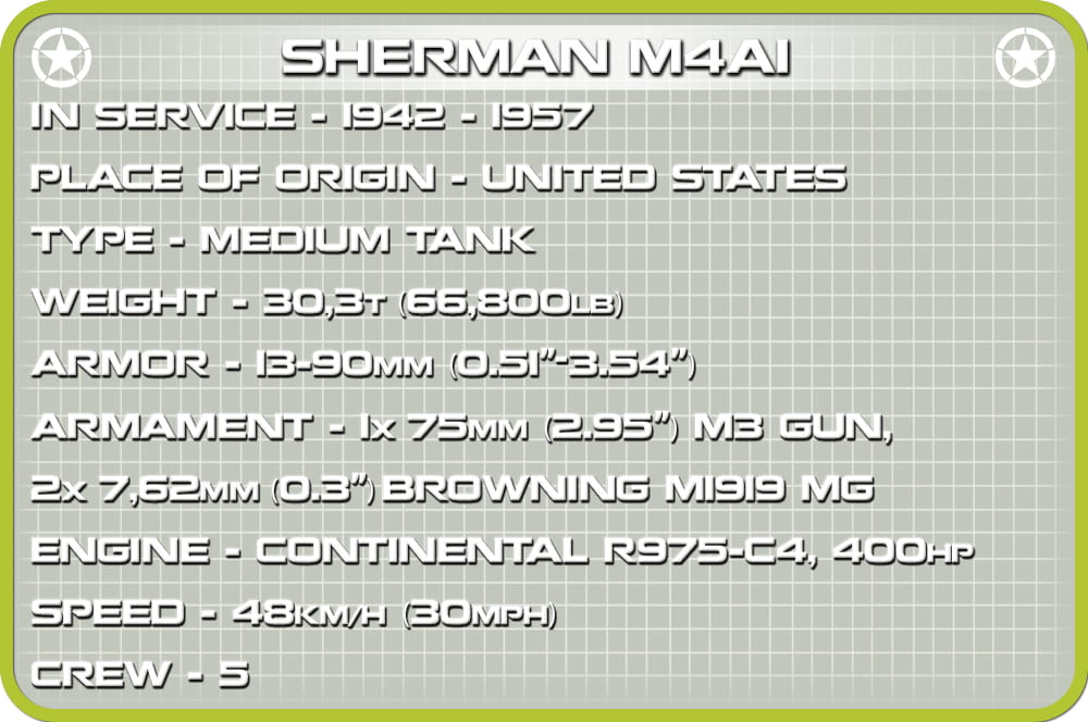 Miniaturowy pojazd z klocków konstrukcyjnych COBI został wyprodukowany w zupełnie nowej skali 1:48. Jest łatwy w budowie, idealnie nadaje się na początek przygody z polskimi klockami konstrukcyjnymi COBI. Posiada ruchome działo, obracającą się wieżę i działającą trakcję gąsienicową. Wszelkie detale graficzne są wysokiej jakości nadrukami, które nie ścierają się nawet w trakcie intensywnej zabawy. Zaletą jest konstrukcja, która w wyjątkowy sposób odzwierciedla oryginalne kształty swego historycznego pierwowzoru. Model czołgu M4 Sherman znakomicie sprawdzi się jako zabawka, ale także wyjątkowy element każdej kolekcji fana militariów i broni pancernej.