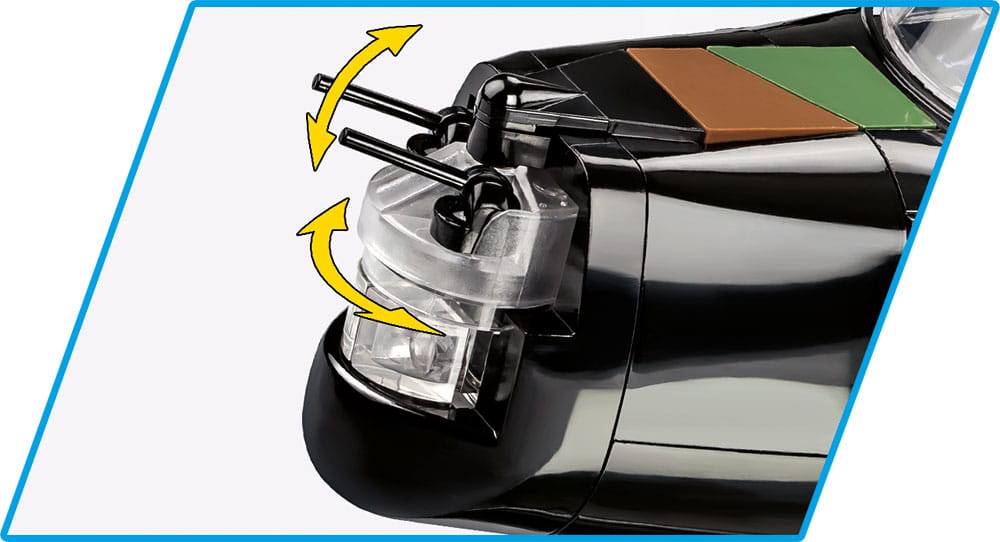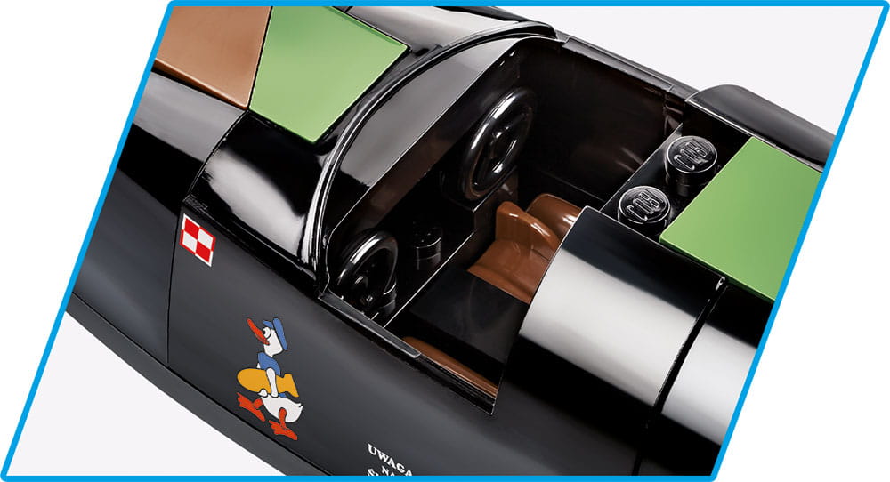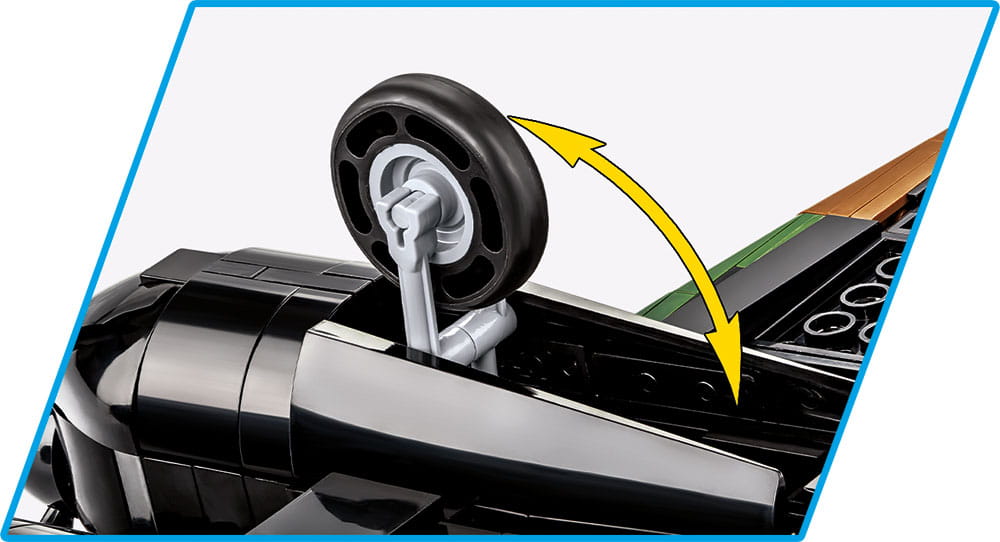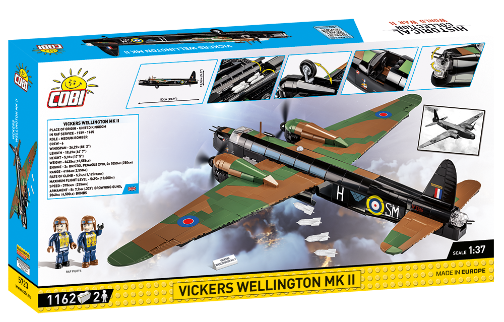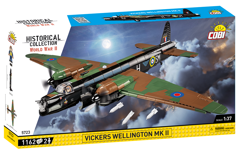 Brytyjski Bombowiec Vickers Wellington został precyzyjnie odwzorowany z klocków konstrukcyjnych COBI w skali 1:37. Samolot ma 53 cm długości i aż 71,5 cm rozpiętości skrzydeł. Przygotowanie tak ogromnego modelu wymagało użycia aż 1162 elementów. W zestawie znajdziemy precyzyjne nadruki, które nie ścierają się w trakcie intensywnego użytkowania. Entuzjaści historii docenią nadrukowane historyczne oznaczenia 305 Dywizjonu Bombowego Ziemi Wielkopolskiej i Lidzkiej im. Marszałka Józefa Piłsudskiego. Nie zabrakło nawet symbolu Kaczora niosącego bombę! Samolot posiada obracające się śmigła, składane koła oraz otwieraną kabinę, w której można umieścić dołączonych do zestawu dwóch pilotów. Luk na spodzie samolotu otwiera się i możemy tam umieścić klockowe bomby. Całość zestawu uzupełnia tabliczka z nadrukowaną nazwą zestawu.