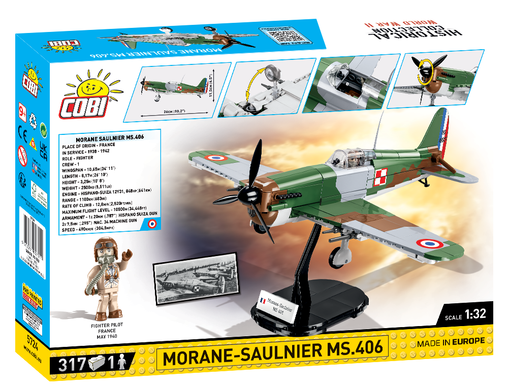 Z 317 klocków konstrukcyjnych COBI wybudujesz świetnie odwzorowany w modelarskiej skali 1:32 francuski samolot myśliwski z okresu drugiej wojny światowej! Ten piękny historyczny model został zaprojektowany z dbałością o detale. Klocki zostały pokryte wysokiej jakości nadrukami, które nie ścierają się nawet w trakcie intensywnego użytkowania.
