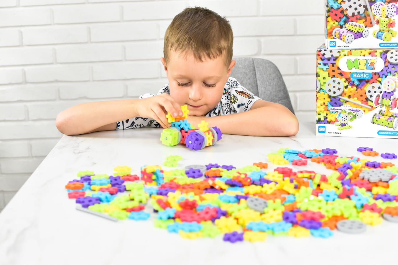 Jeśli zestaw 200 lub 400 to dla Twojego dziecka za mało, to najwyższy czas by wybrać nieco większy zestaw, mianowicie Constructor 600. Pamiętaj, że wraz z liczbą elementów podstawowych, czyli puzzli, zwiększa się liczba kształtów takich jak koła, osie oraz sześcioboki, pozwalając tym samym na budowę konstrukcji ruchomych na większą skalę. Można tworzyć własne budowle albo zaczerpnąć pomysły z dołączonej książeczki. Większy zestaw to dla dziecka gwarancja jeszcze lepszej zabawy nie tylko samemu, ale także w gronie przyjaciół!