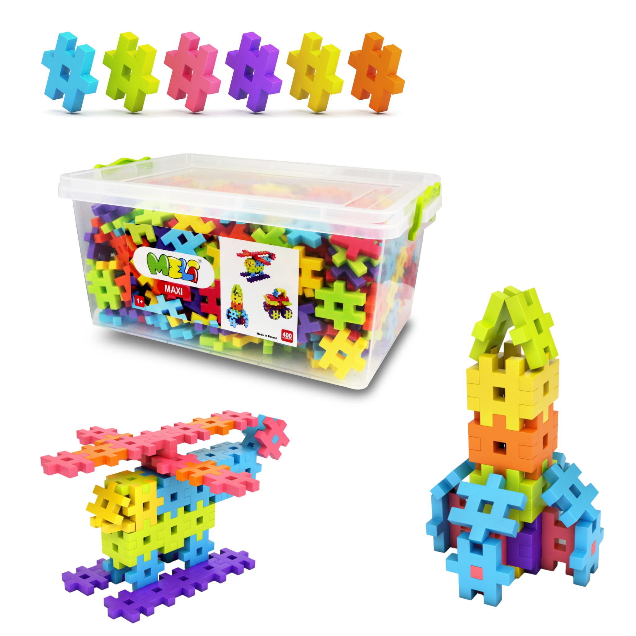 Dzieci uwielbiają fantazji, a my możemy pomóc im te fantazje zmaterializować! Zestaw klocków MELI MAXI 400 to ogromna kolekcja elementów inspirujących do tworzenia postaci z bajek, samochodów, robotów, kaczuszek czy koników. Zaprojektowane by cieszyć dzieci już od pierwszego roku życia, wygodne i poręczne części pasują do siebie niczym puzzle; łatwo się je łączy i równie przyjemnie demontuje. Szukasz pomysłu na prezent? Taka liczba elementów daje pewność, że kolorowym i zachęcającym do kreatywnej zabawy zestawem możesz obdarować rodzeństwo lub zapewnić zabawę całej grupie dzieci, bez obaw, że zabraknie klocków. Klocki spakowane są w wygodne i praktyczne pudełko, dzięki czemu masz pewność, że po skończonej zabawie wszystkie elementy znajdą się w bezpiecznym miejscu, zapewniając porządek w dziecięcym pokoju. Pamiętaj – im większa ilość elementów, tym lepsza zabawa!