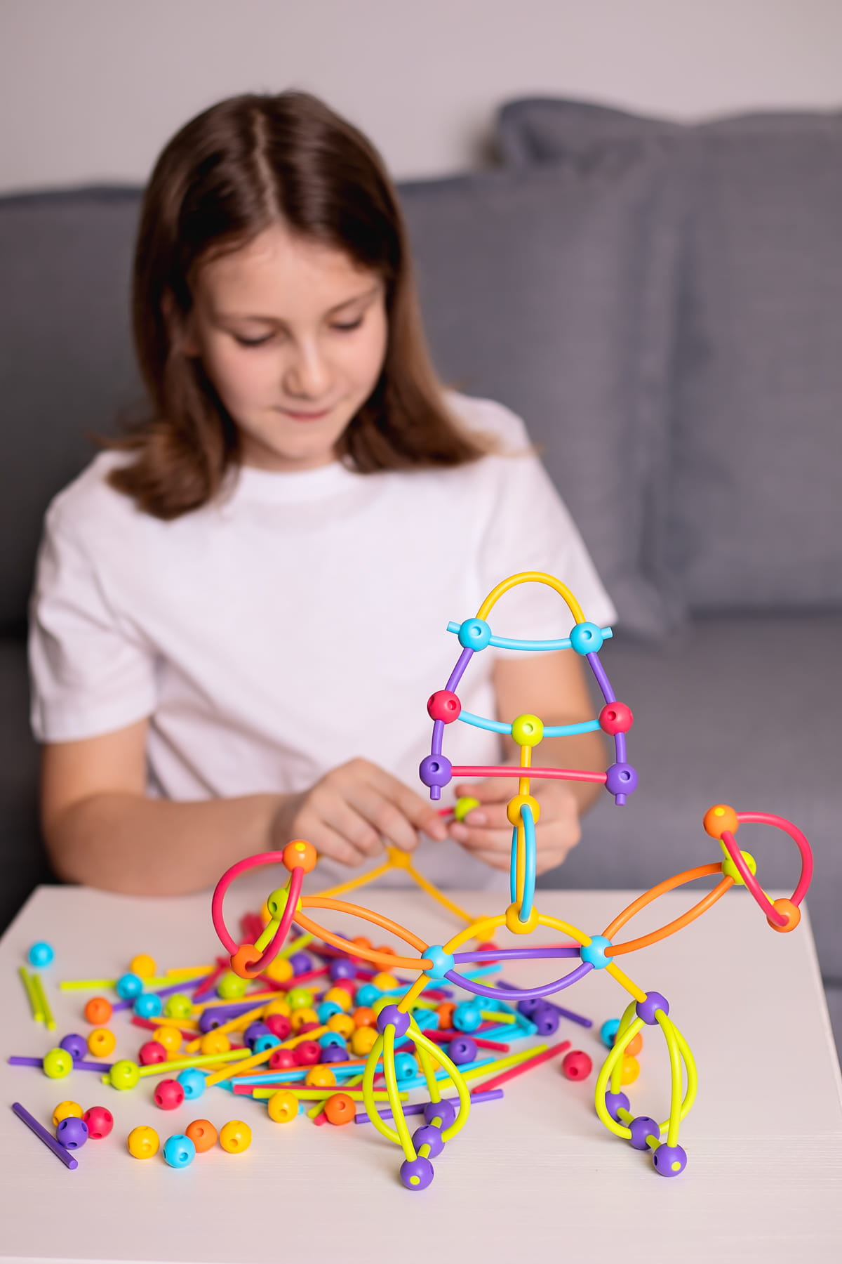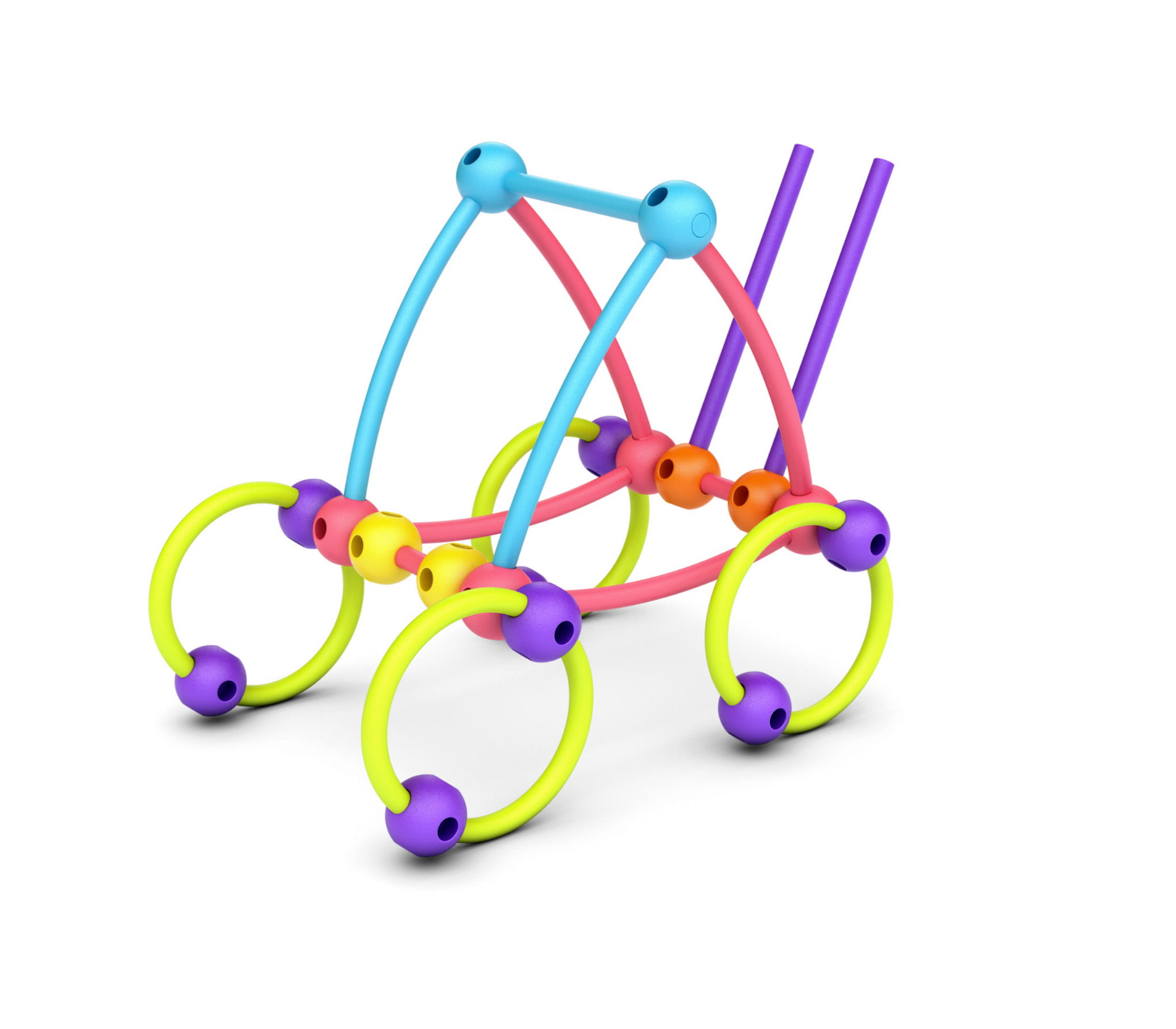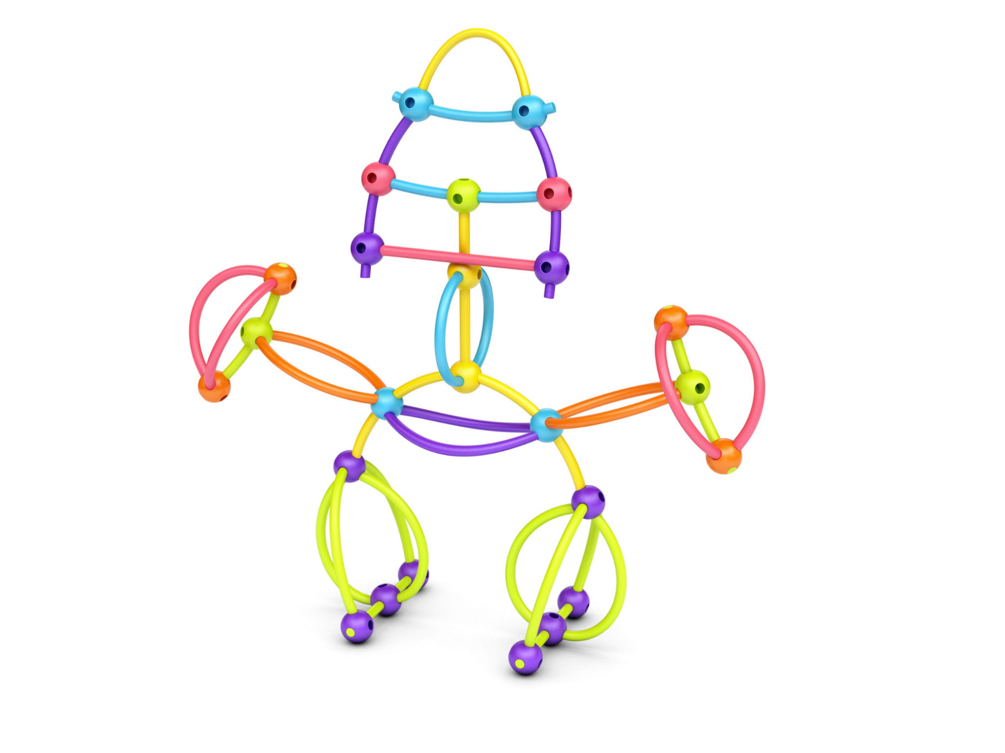 Niezwykle proste elementy – giętkie patyczki i kulki z otworami – wykonane z miękkiego tworzywa są całkowicie bezpieczne dla drobnych, zwinnych paluszków. Dzięki żywym barwom nawet już najmłodsze dzieci chętnie sięgają po te intrygujące klocki, by konstruować wszystko to, co pojawia się w ich wyobraźni.