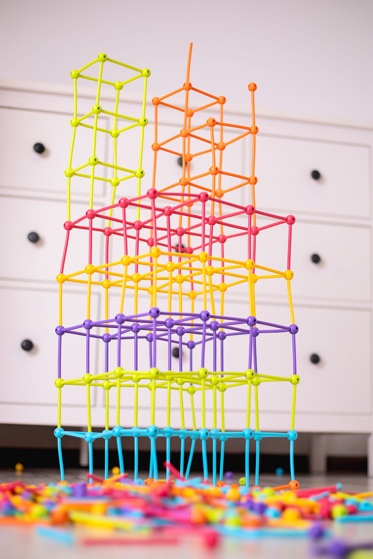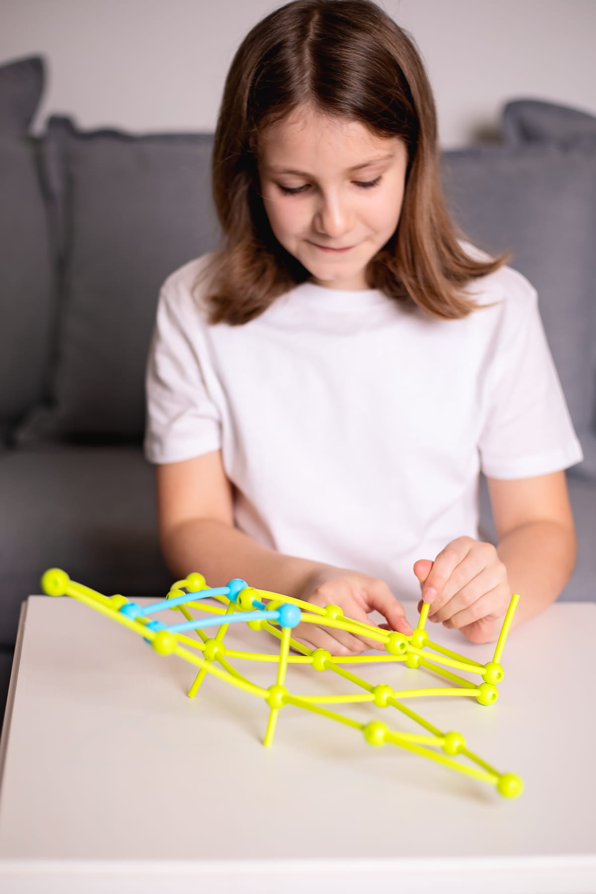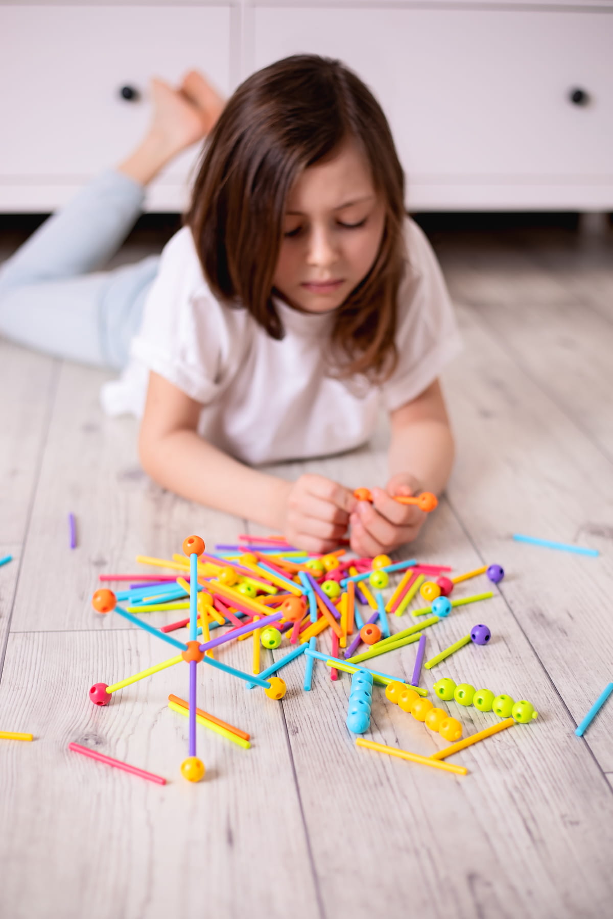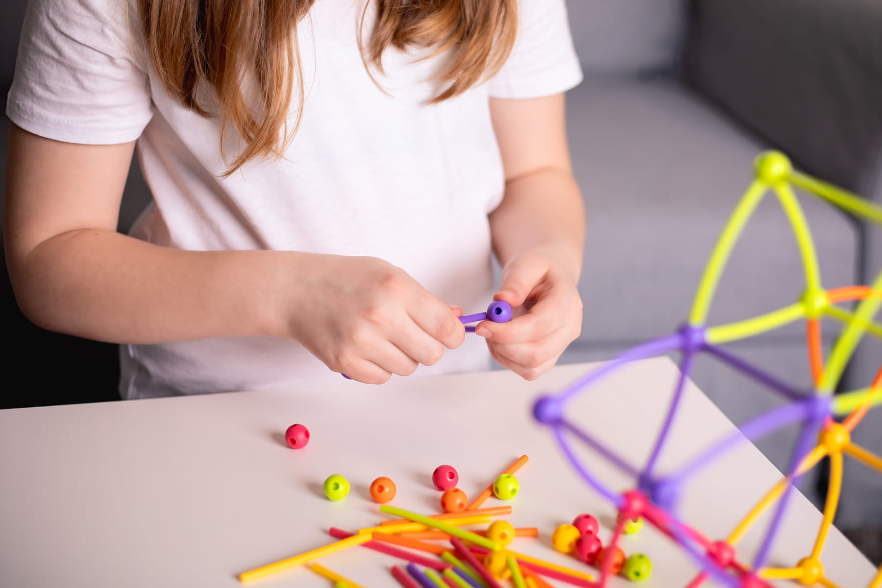 Niezwykle proste elementy – giętkie patyczki i kulki z otworami – wykonane z miękkiego tworzywa są całkowicie bezpieczne dla drobnych, zwinnych paluszków. Dzięki żywym barwom nawet już najmłodsze dzieci chętnie sięgają po te intrygujące klocki, by konstruować wszystko to, co pojawia się w ich wyobraźni.