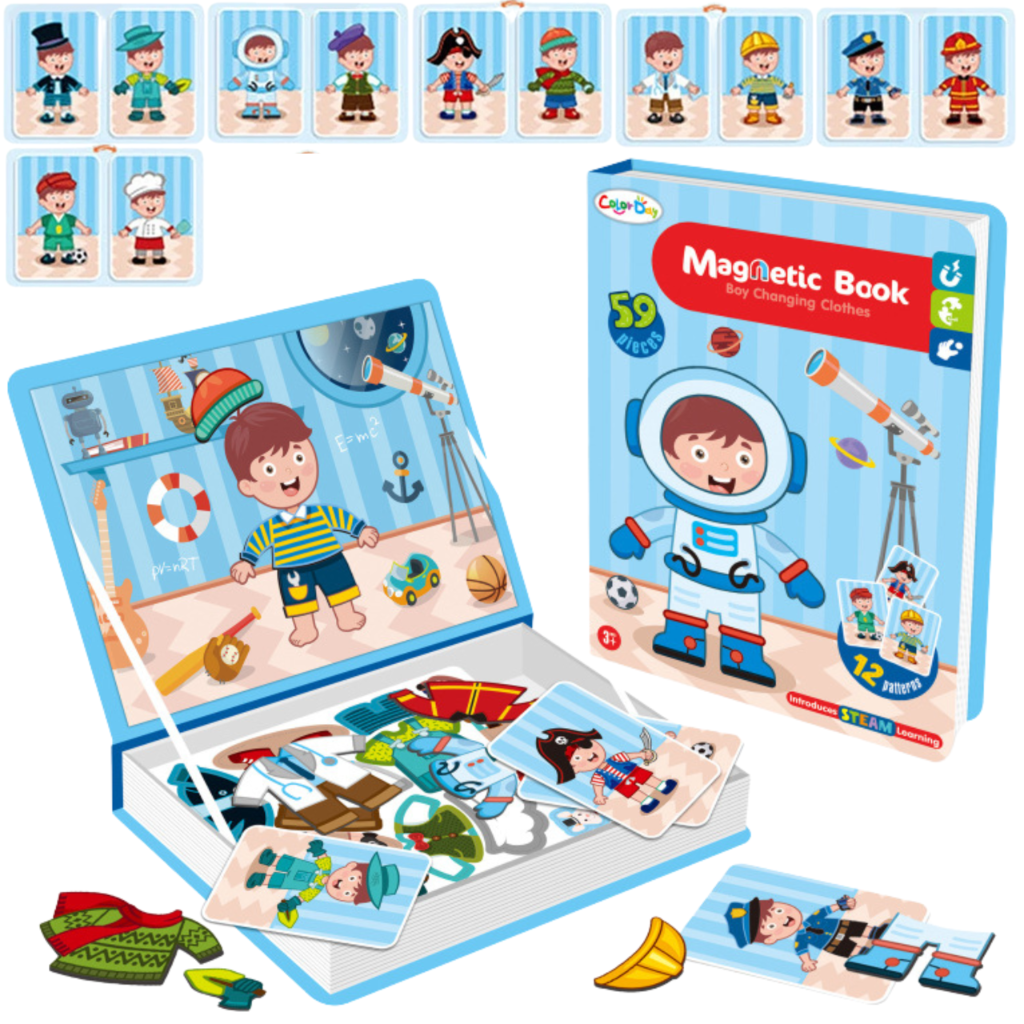 UKŁADANKA MAGNETYCZNA ZAŁÓŻ UBRANIA DLA CHŁOPCA W KSIĄŻCE to kreatywna zabawka edukacyjna, która pozwala dziecku tworzyć stylizacje, dopasowywać ubrania i poznawać różne role oraz zawody. Forma zamykanej książki sprawia, że zestaw jest wygodny w przechowywaniu, łatwy do zabrania w podróż i gotowy do zabawy w domu, samochodzie lub na wakacjach.