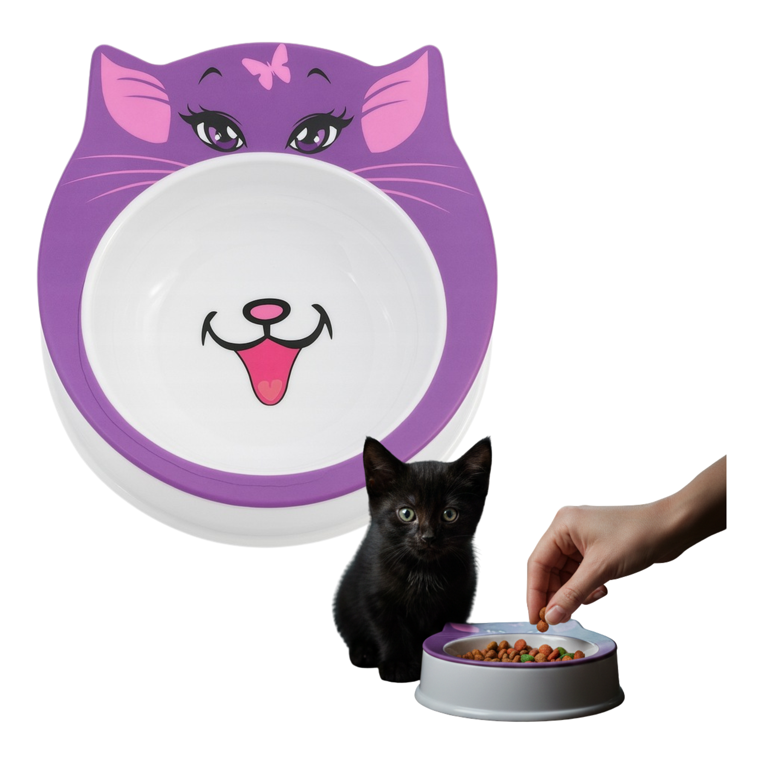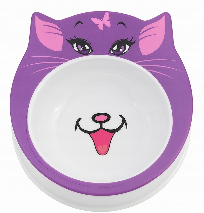 Miska MISIO wyróżnia się dopracowanym designem: ma kształt głowy kota, a jej obrzeże jest w intensywnym odcieniu fioletu z różowymi detalami. Na górnej części widoczna jest grafika kocich oczu, uszu oraz małego motyla, co nadaje całości przyjemny, dekoracyjny charakter.