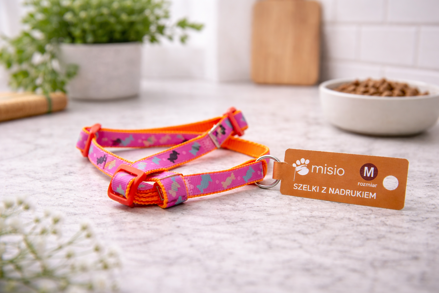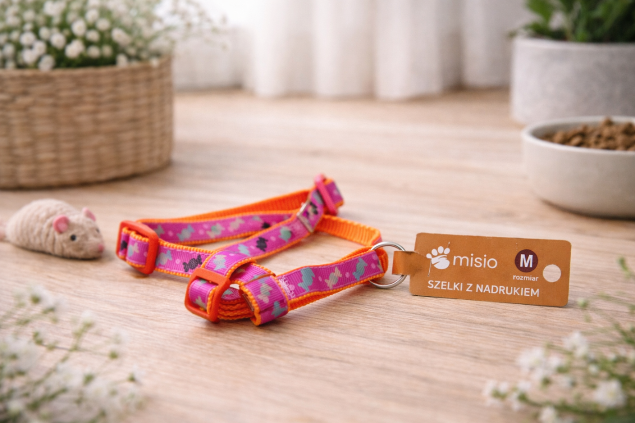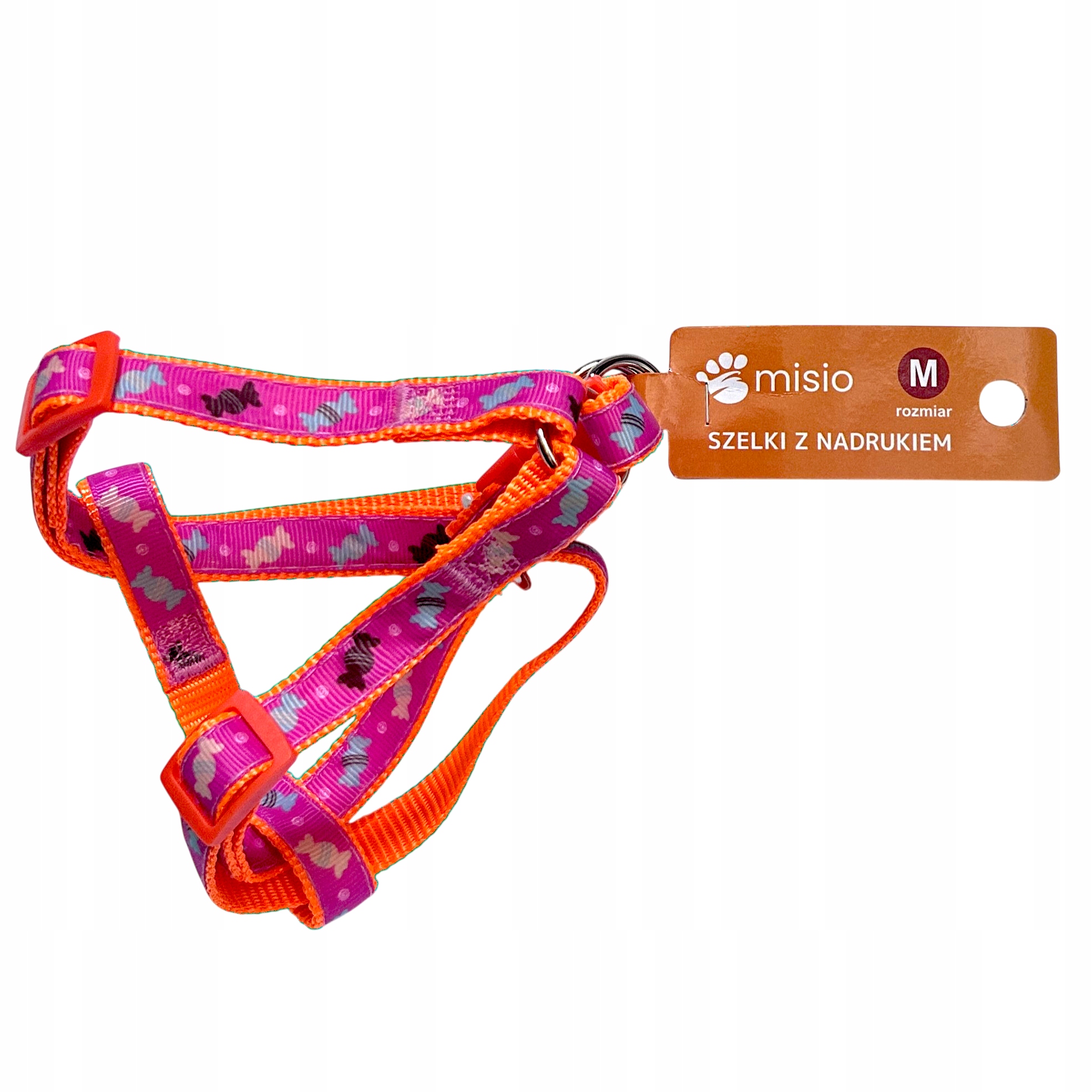 Podsumowanie – dlaczego warto kupić: MISIO szelki z nadrukiem rozmiar M w kolorze pomarańczowo-różowym to lekkie, regulowane szelki dla psa do codziennych spacerów. Konstrukcja step-in ułatwia zakładanie, a możliwość regulacji i metalowe kółko do smyczy zapewniają wygodę i kontrolę podczas wyjść.