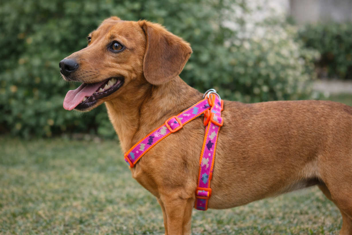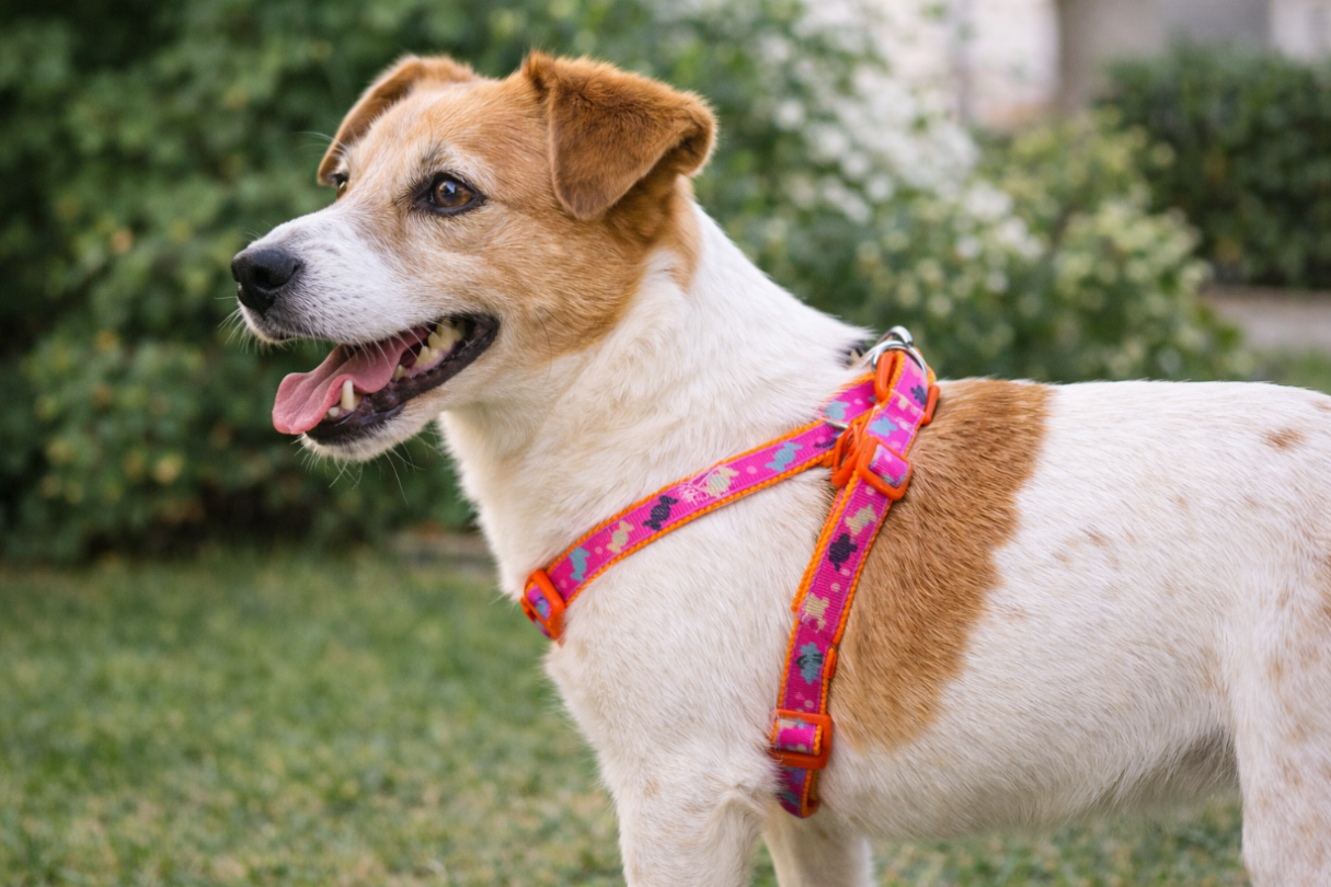 - Wyrazisty nadruk – pomarańczowo-różowa kolorystyka i wzór sprawiają, że szelki dobrze się prezentują i są łatwe do zauważenia.