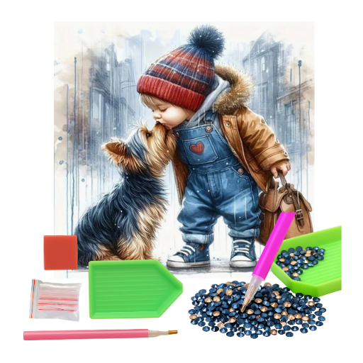 MOZAIKA DIAMENTOWA - DZIECKO I PIES BUZIAK W DESZCZU