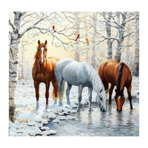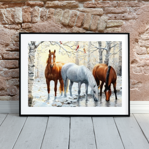 MOZAIKA DIAMENTOWA - KONIE NAD ZIMOWYM STAWEM, ZIMA