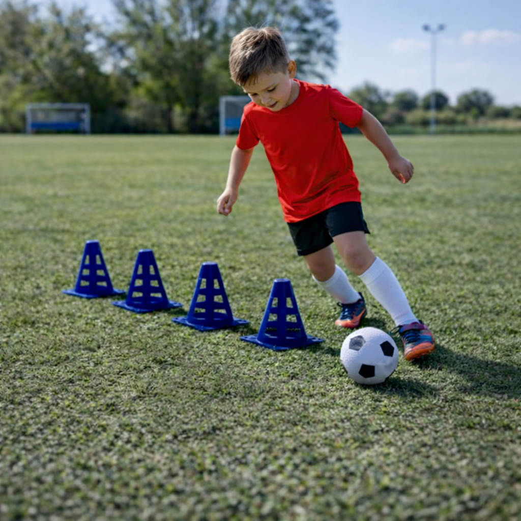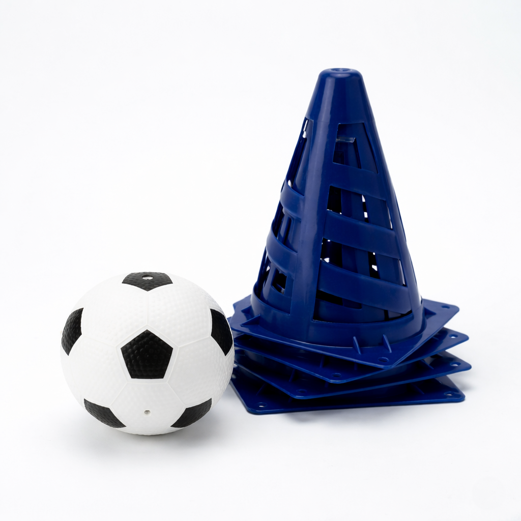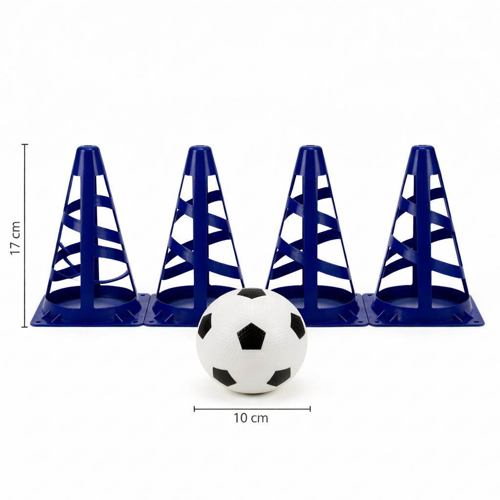Zestaw zawiera 4 lekkie pachołki oraz piłkę, dzięki czemu dziecko może ćwiczyć prowadzenie piłki, omijanie przeszkód, szybkie zwroty i podstawowe elementy gry. Pachołki treningowe piłkarskie dla dzieci pomagają rozwijać refleks, zwinność i koordynację ruchową w naturalny, angażujący sposób.