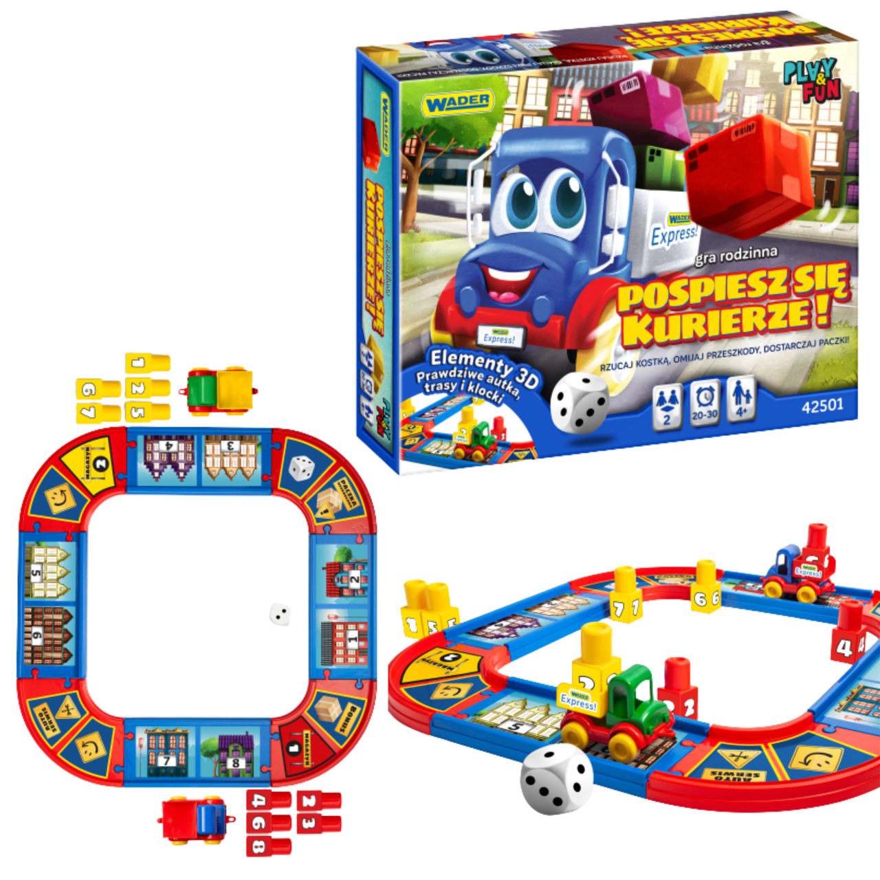 Pospiesz się Kurierze! to połączenie gry planszowej z przestrzennymi elementami 3D, w której uczestnicy mają możliwość sprawdzenia się w pracy kuriera. Pionkami w grze są autka, którymi gracz rozwozi paczki pod wskazane adresy, co nadaje grze realizmu. To gra dla całej rodziny, pełna atrakcji, przygód i nieoczekiwanych zwrotów akcji, której zasady są proste i zrozumiałe dla graczy w każdym wieku.