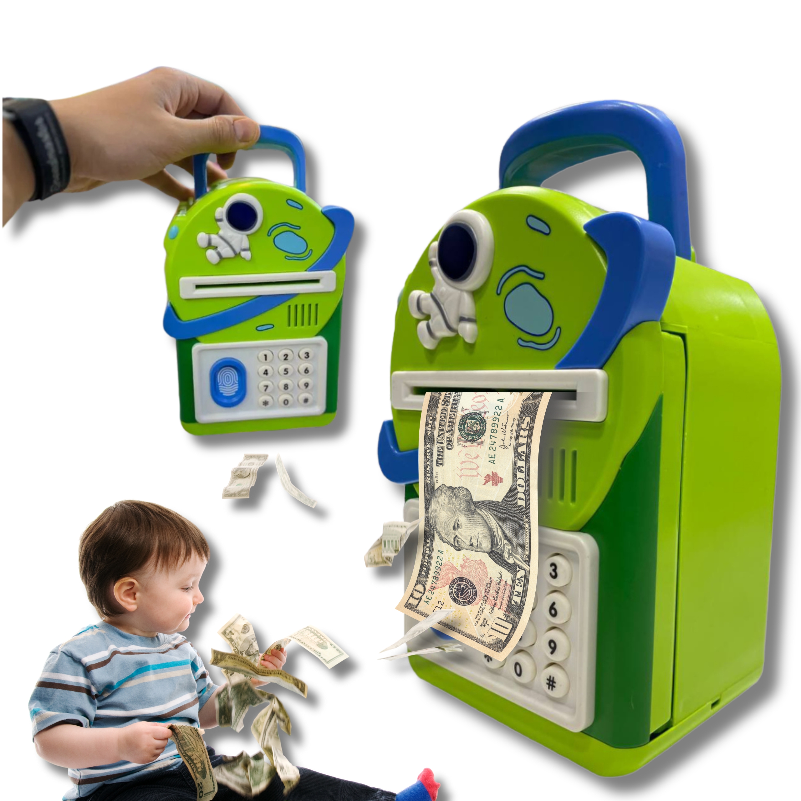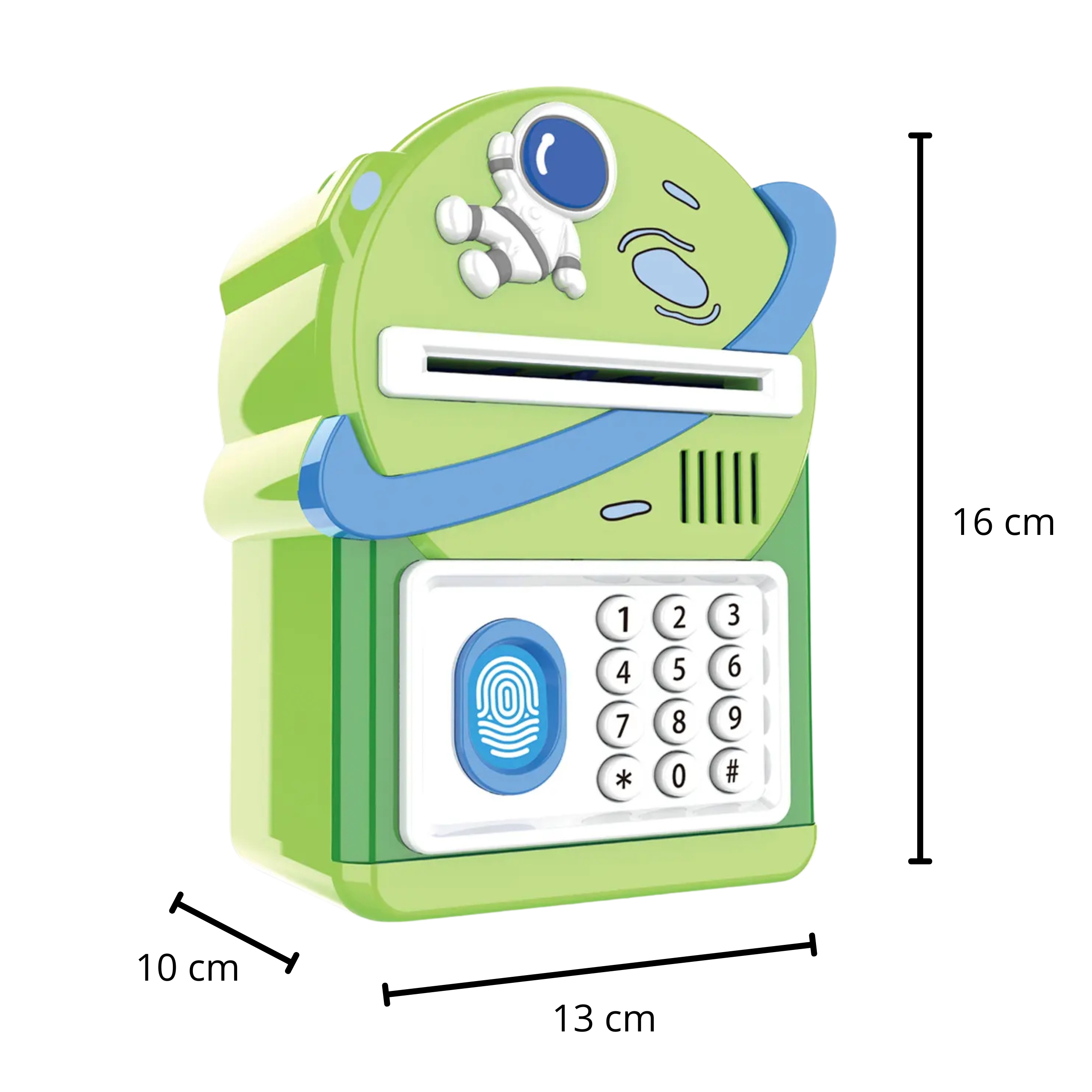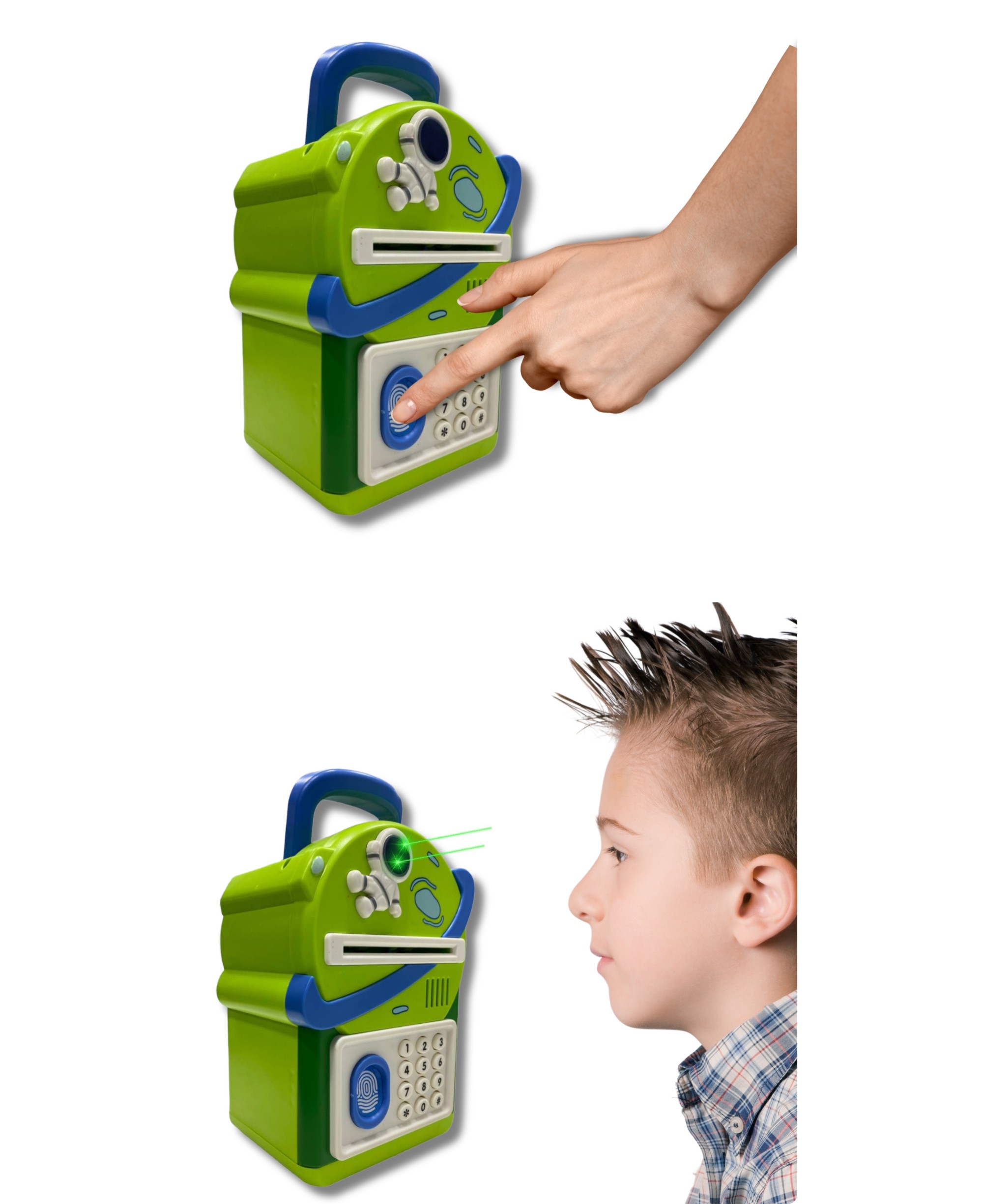 Model został zaprojektowany tak, aby jak najlepiej odwzorować działanie prawdziwego sejfu bankowego. Otwieranie skarbonki odbywa się po wpisaniu kodu PIN, a dodatkowa funkcja skanowania palca zwiększa realizm użytkowania i sprawia, że zabawka staje się jeszcze bardziej atrakcyjna dla dziecka.