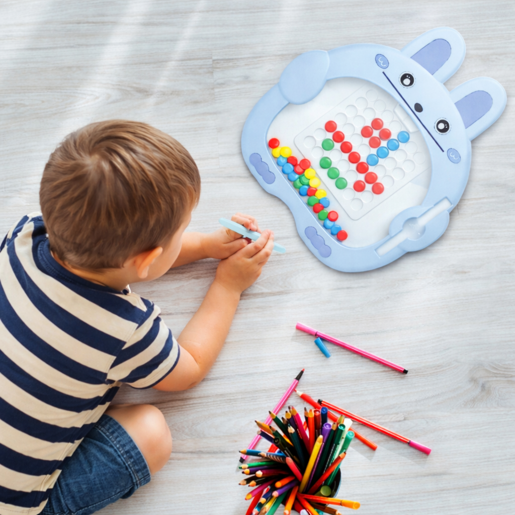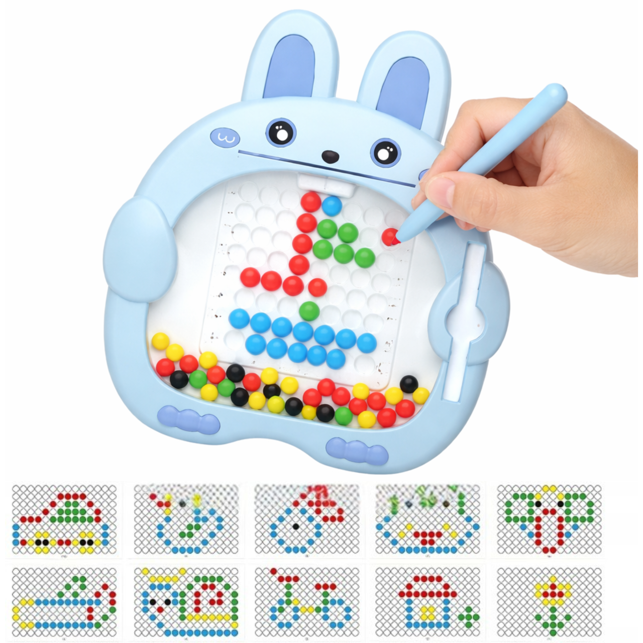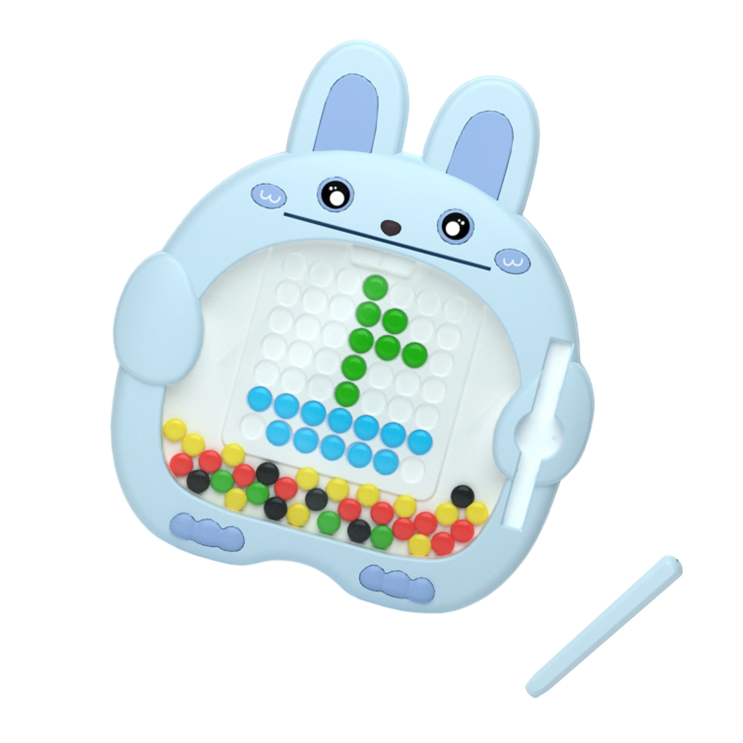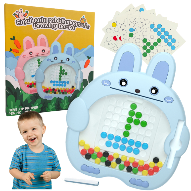 Tablica Magnetyczna Montessori Królik to urocza i funkcjonalna zabawka edukacyjna, która łączy naukę z codzienną zabawą. Niebieska forma króliczka od razu przyciąga uwagę dziecka, a kolorowa mozaika zachęca do tworzenia własnych obrazków, odwzorowywania wzorów i ćwiczenia precyzji ruchów. To świetna propozycja dla rodziców, którzy szukają produktu rozwijającego koncentrację, kreatywność i sprawność manualną.