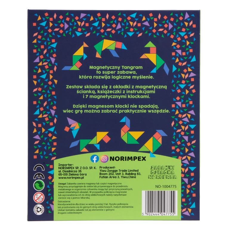 Tangram to klasyczna chińska łamigłówka, znana i uwielbiana przez dzieci i dorosłych na całym świecie. Nasza wersja Tangrama składa się z siedmiu elementów, które są figurami geometrycznymi o różnych kształtach. Dzieci uwielbiają zabawą tangramem. Dodatkowo zabawka pomaga rozwijać ich zdolności manualne, motorykę rąk oraz zmysł logicznego myślenia.