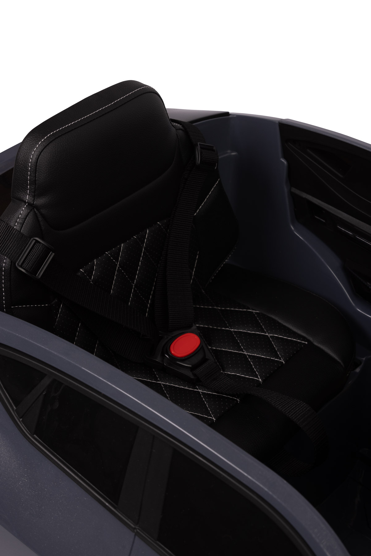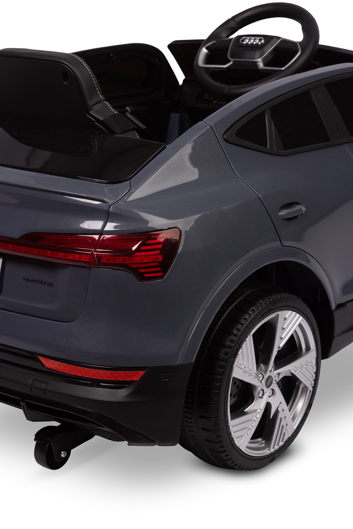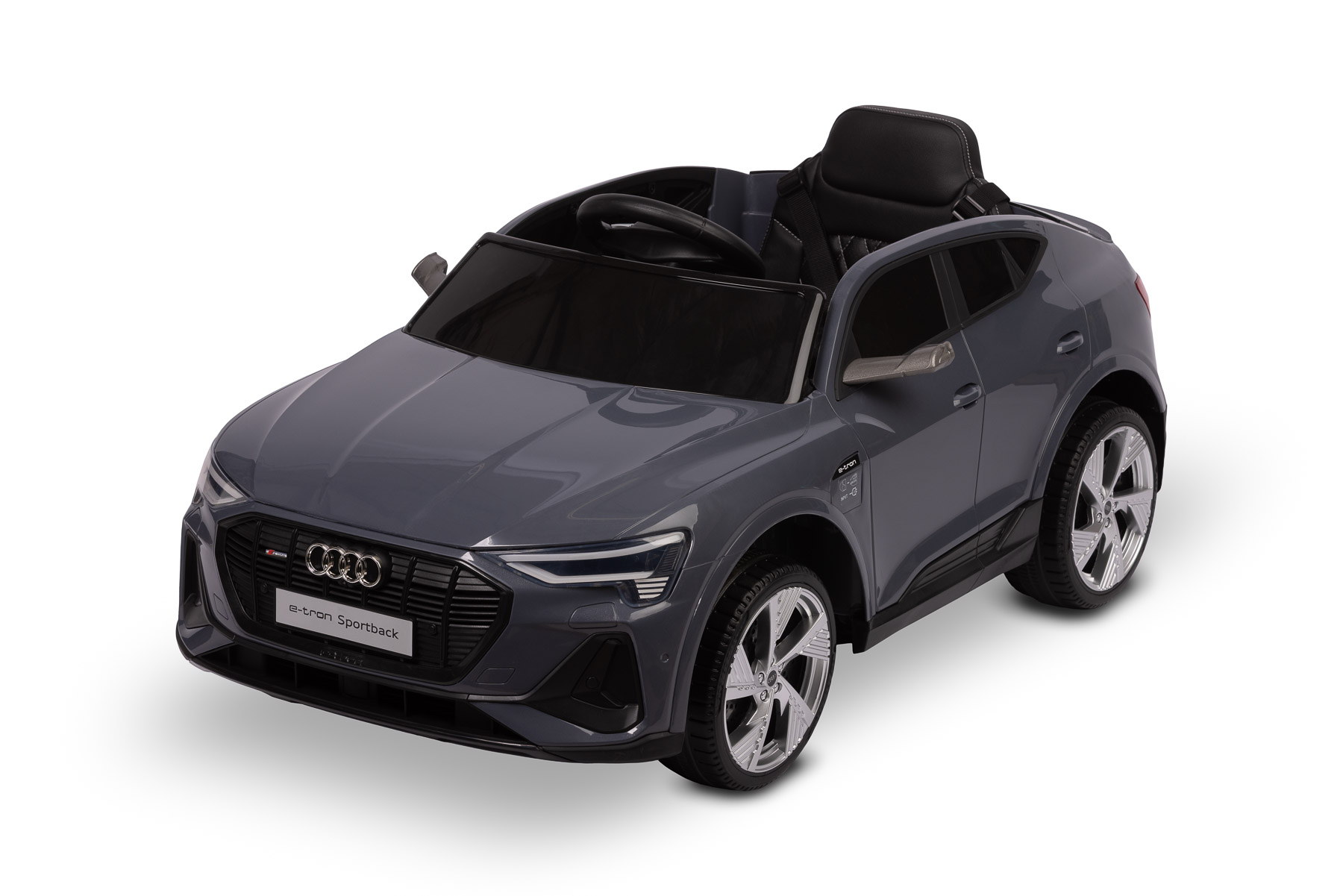 TOYZ Audi E-tron Sportback został zaprojektowany na licencji Audi, dlatego wyróżnia się charakterystyczną linią nadwozia, nowoczesnymi lusterkami oraz łączoną tylną belką świateł. Szary kolor dodaje pojazdowi elegancji i podkreśla jego nowoczesny, miejski charakter.