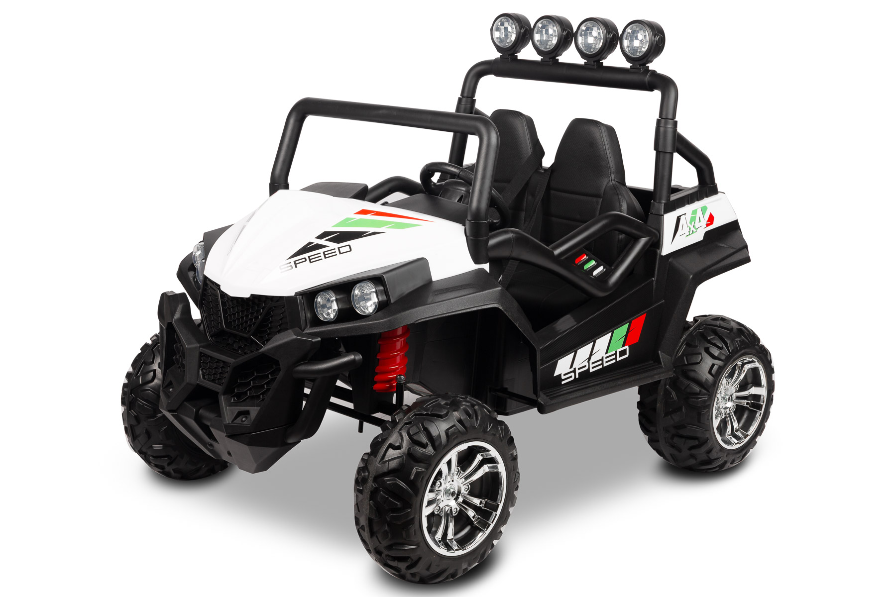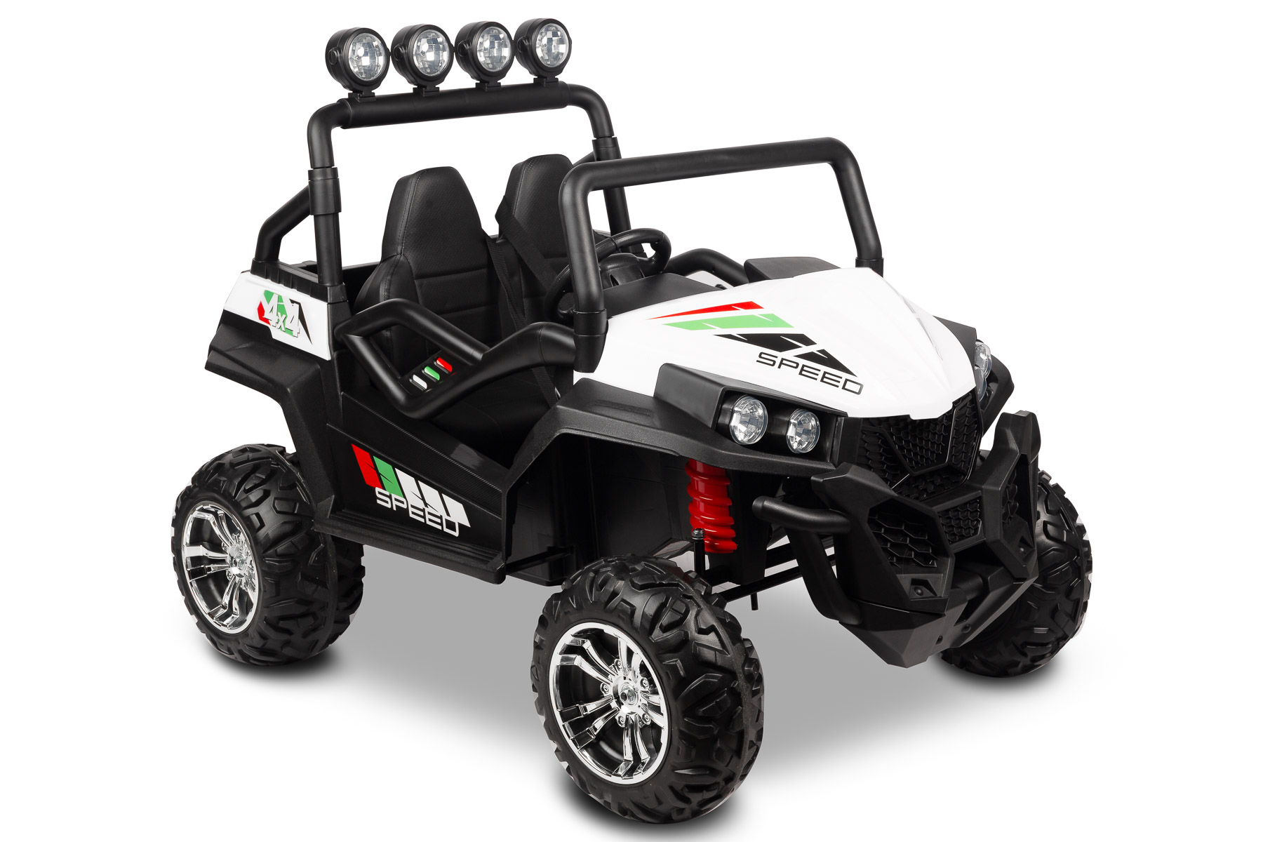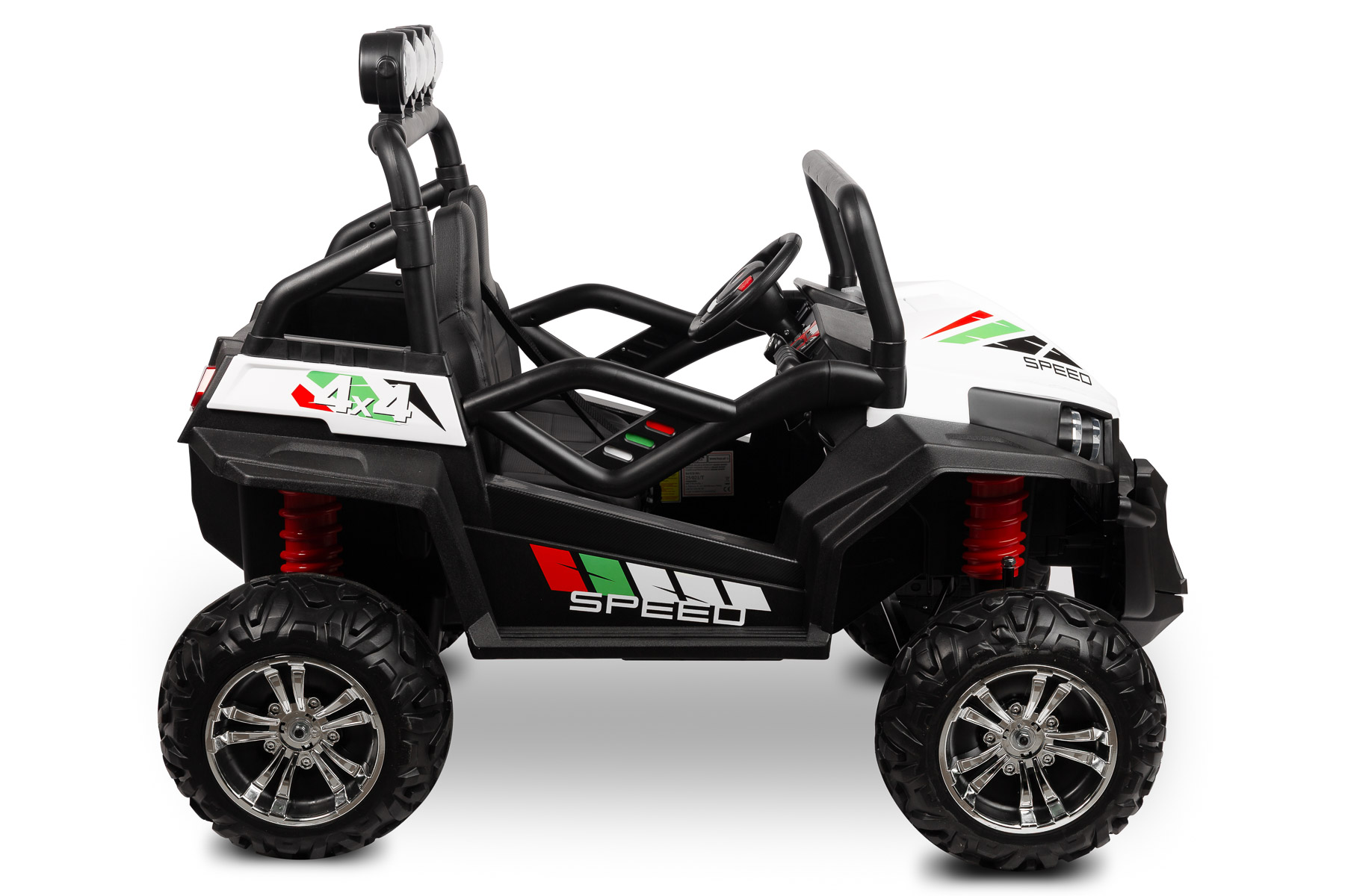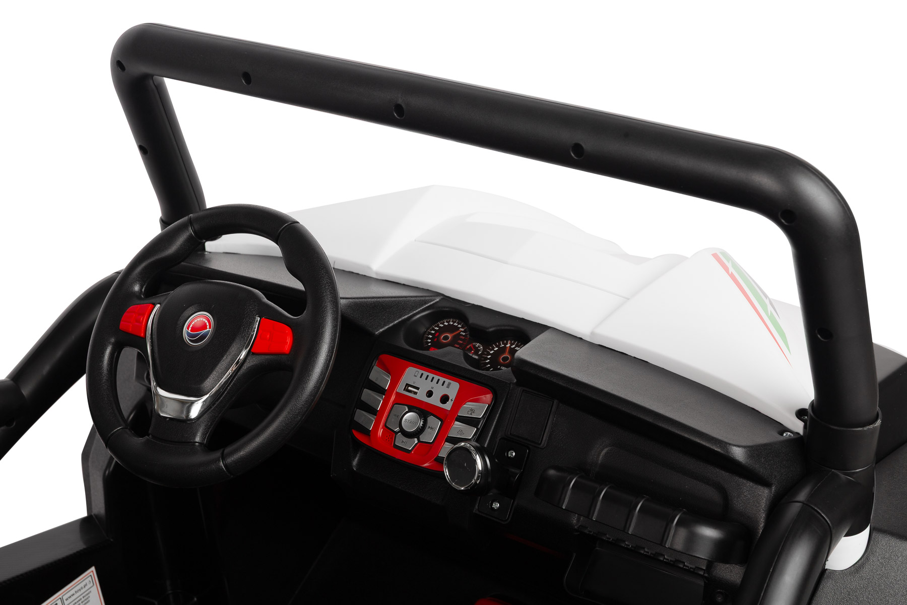 Grand Buggy został zaprojektowany w stylu nowoczesnego pojazdu off-road. Wyrazista linia nadwozia, duże koła, wysoka poprzeczka z dodatkowymi światłami oraz biały kolor karoserii nadają mu sportowy, dynamiczny charakter. To pojazd elektryczny dla dzieci, który wygląda nowocześnie i realistycznie, dlatego świetnie sprawdza się jako prezent dla małych fanów motoryzacji.