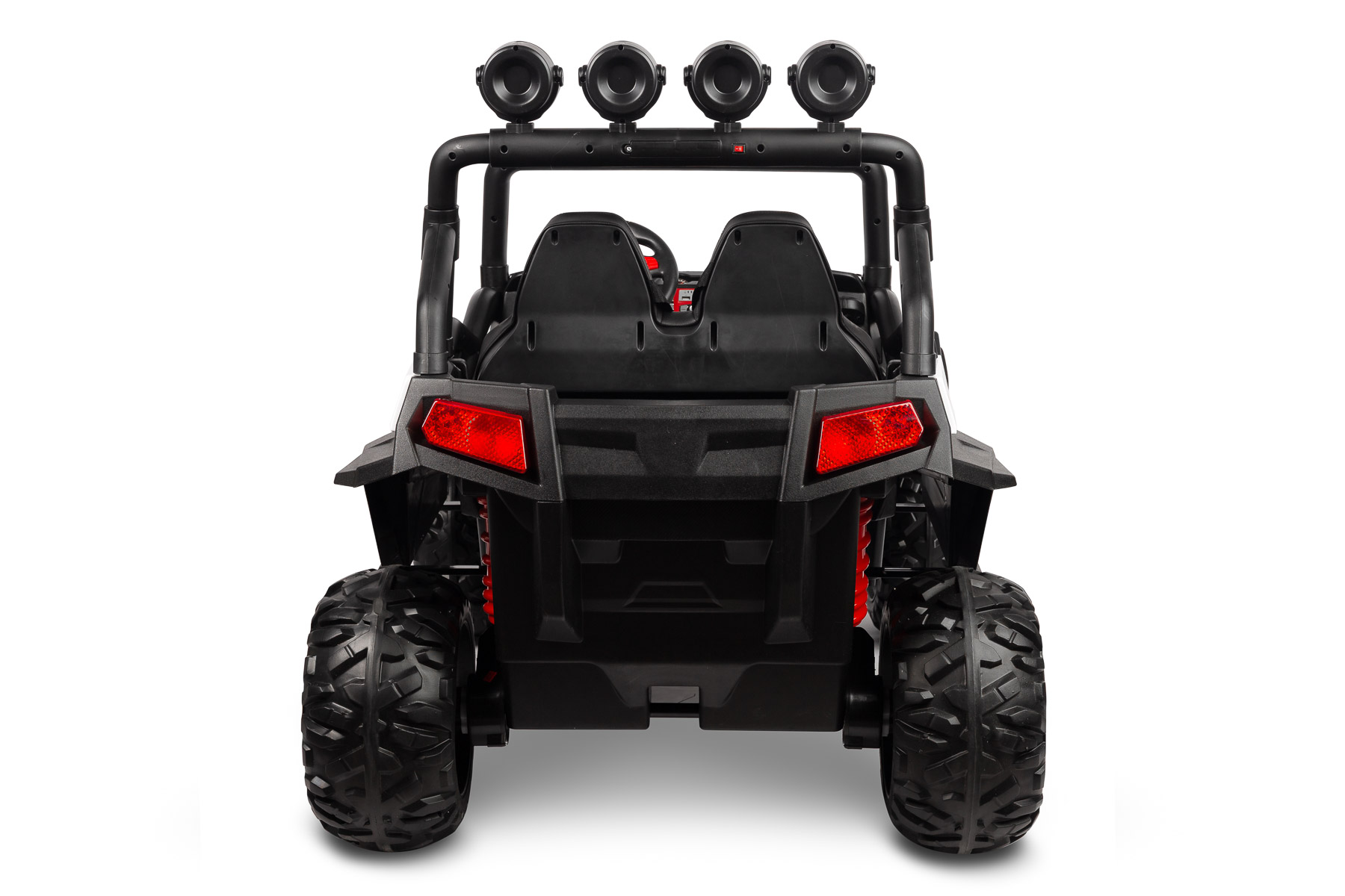 Na podstawie materiałów produktowych widać, że model posiada układ z dwoma miejscami, co zwiększa wygodę i podkreśla jego większy format. Dodatkowym atutem są zamykane drzwi, interaktywna kierownica z dźwiękami oraz przednie światła uruchamiane przyciskiem w kokpicie. Efekt wizualny wzmacniają także dodatkowe światła LED umieszczone na poprzeczce.