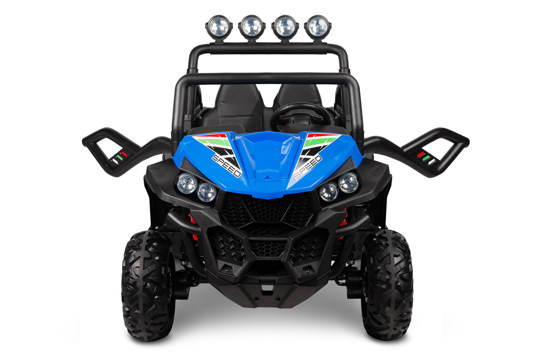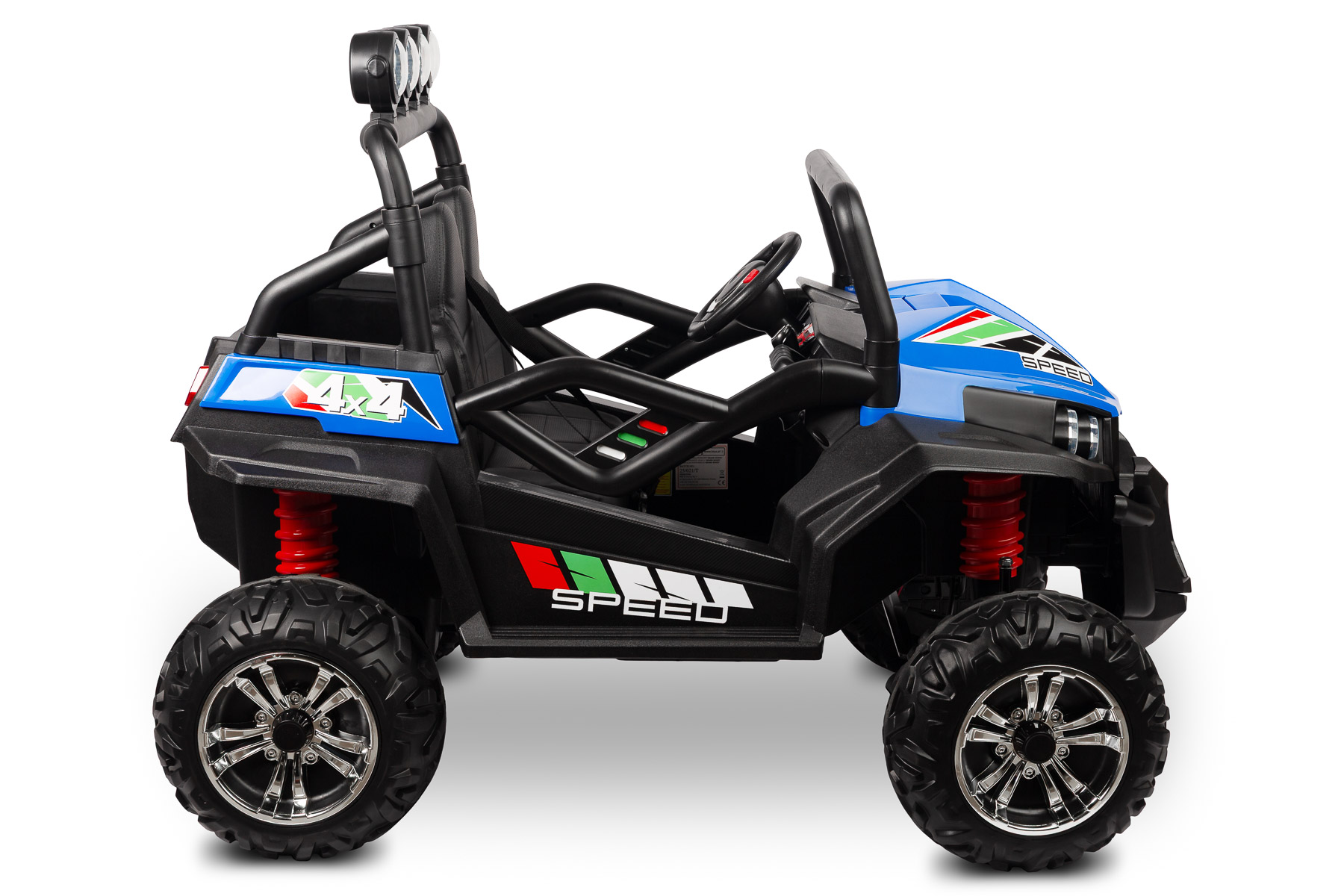 Grand Buggy został zaprojektowany w stylu nowoczesnego pojazdu off-road. Wyrazista linia nadwozia, duże koła, wysoka poprzeczka z dodatkowymi światłami oraz niebieski kolor karoserii nadają mu sportowy, dynamiczny charakter. To pojazd elektryczny dla dzieci, który wygląda nowocześnie i realistycznie, dlatego świetnie sprawdza się jako prezent dla małych fanów motoryzacji.