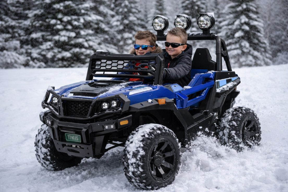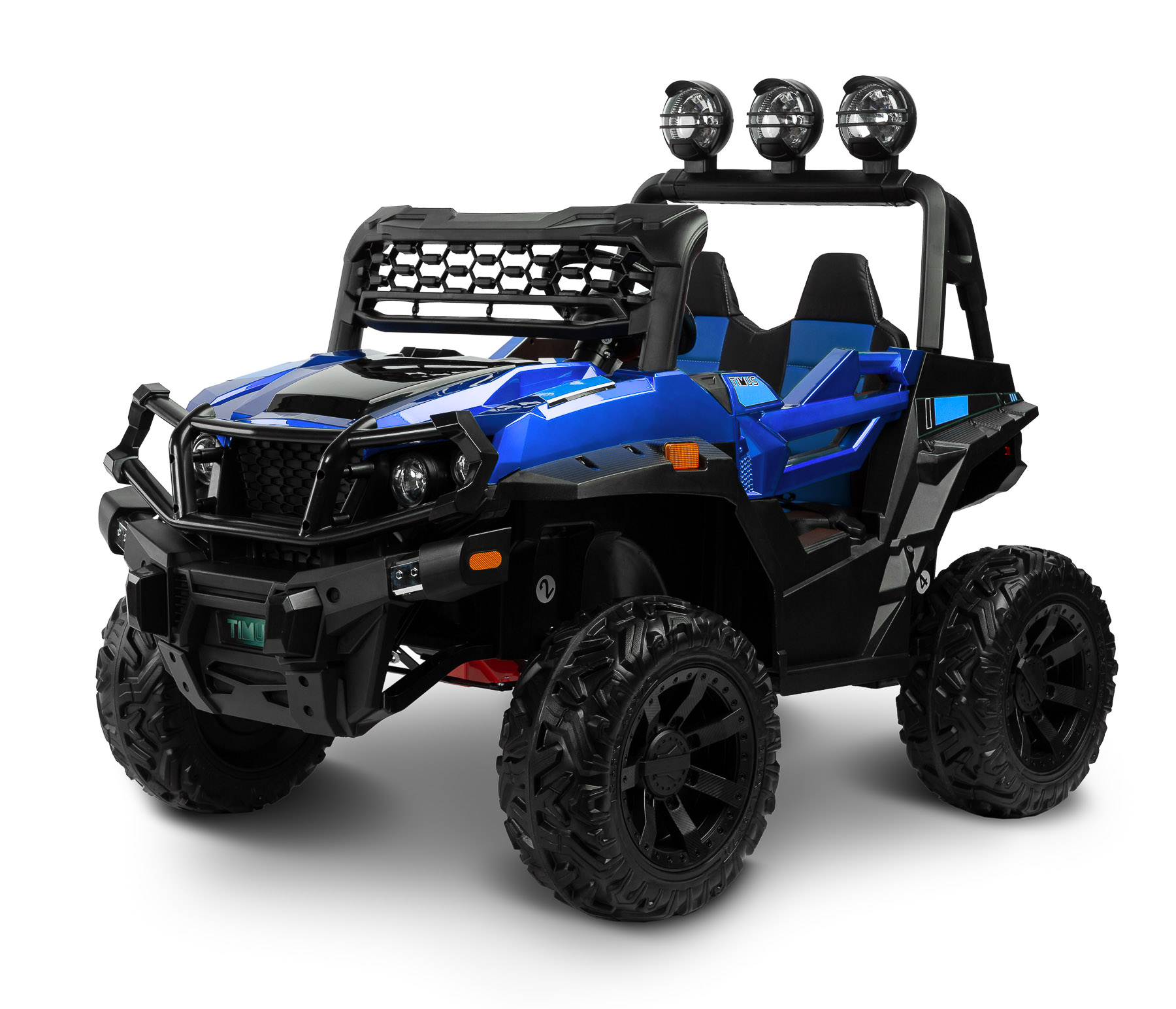 TOYZ Timus został zaprojektowany w stylu auta off-road, dlatego wyróżnia się wysoką konstrukcją, 20-centymetrowym prześwitem i dużymi kołami z głębokim bieżnikiem. Niebieska karoseria dobrze komponuje się z terenowymi detalami, tworząc pojazd elektryczny dla dzieci o nowoczesnym i wyrazistym charakterze.