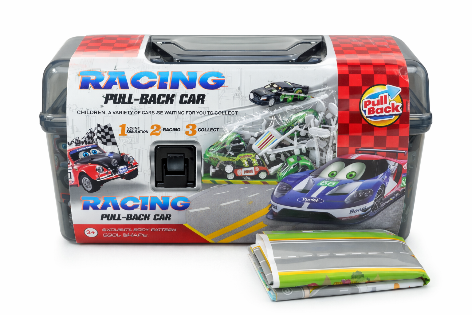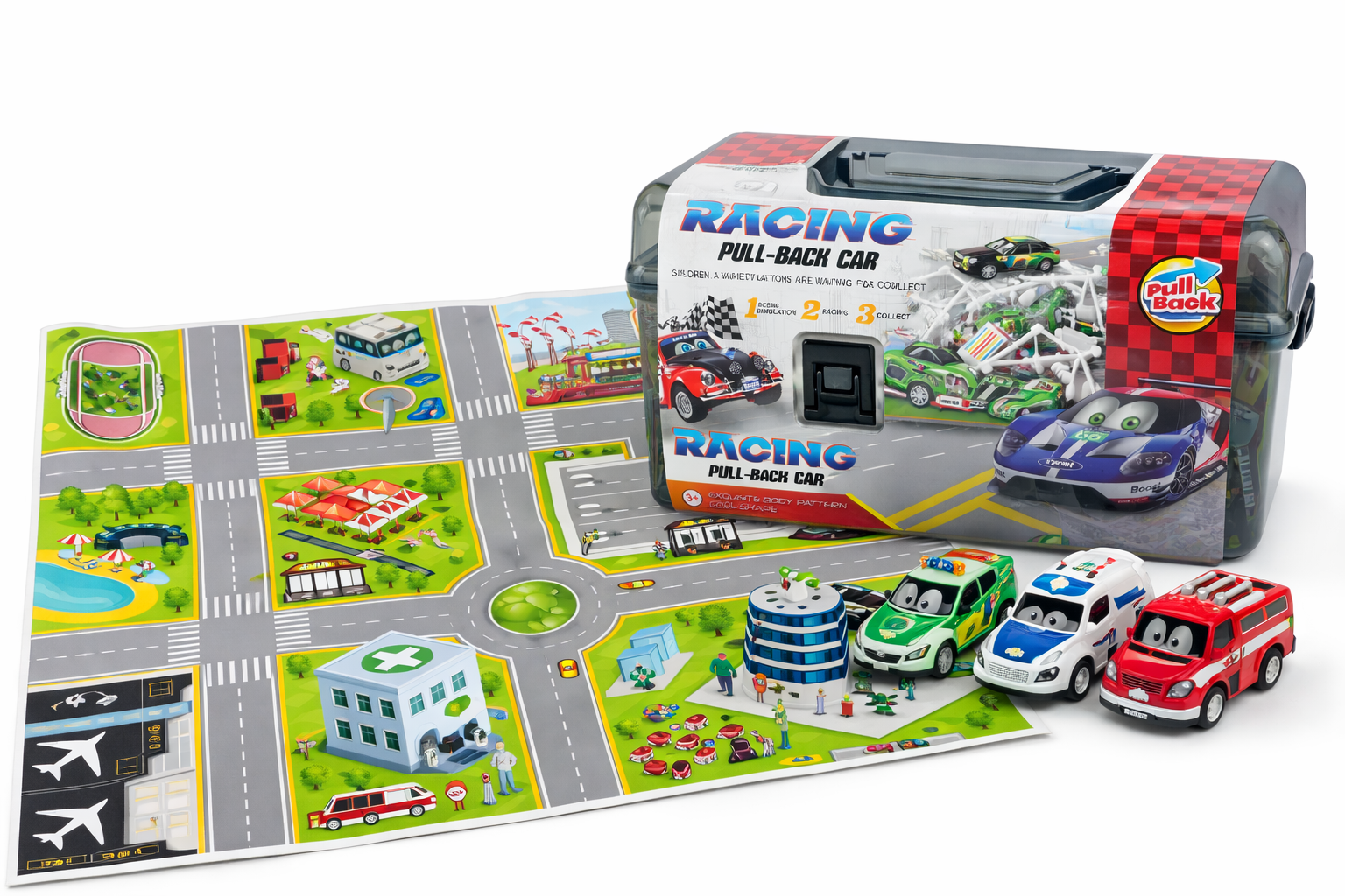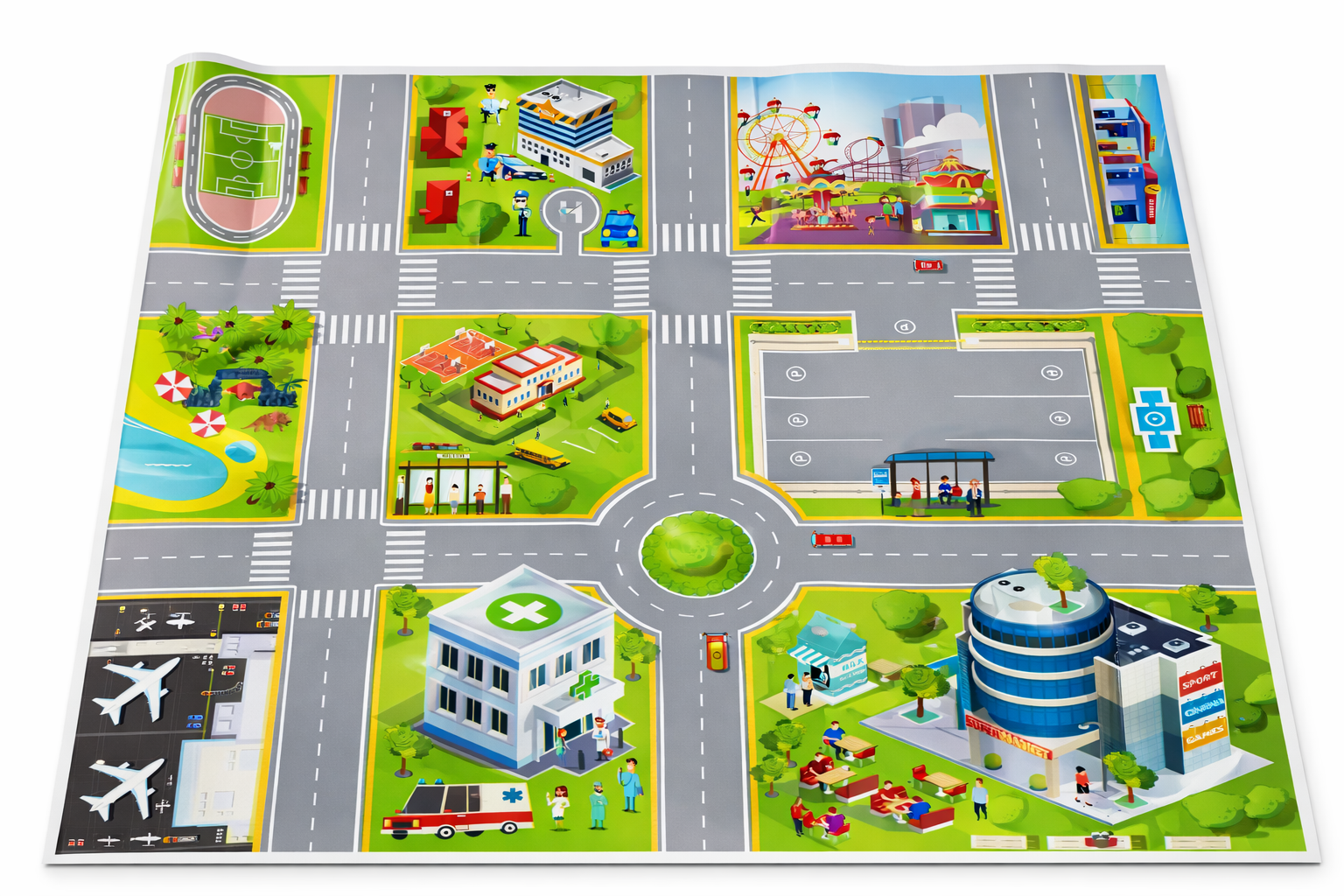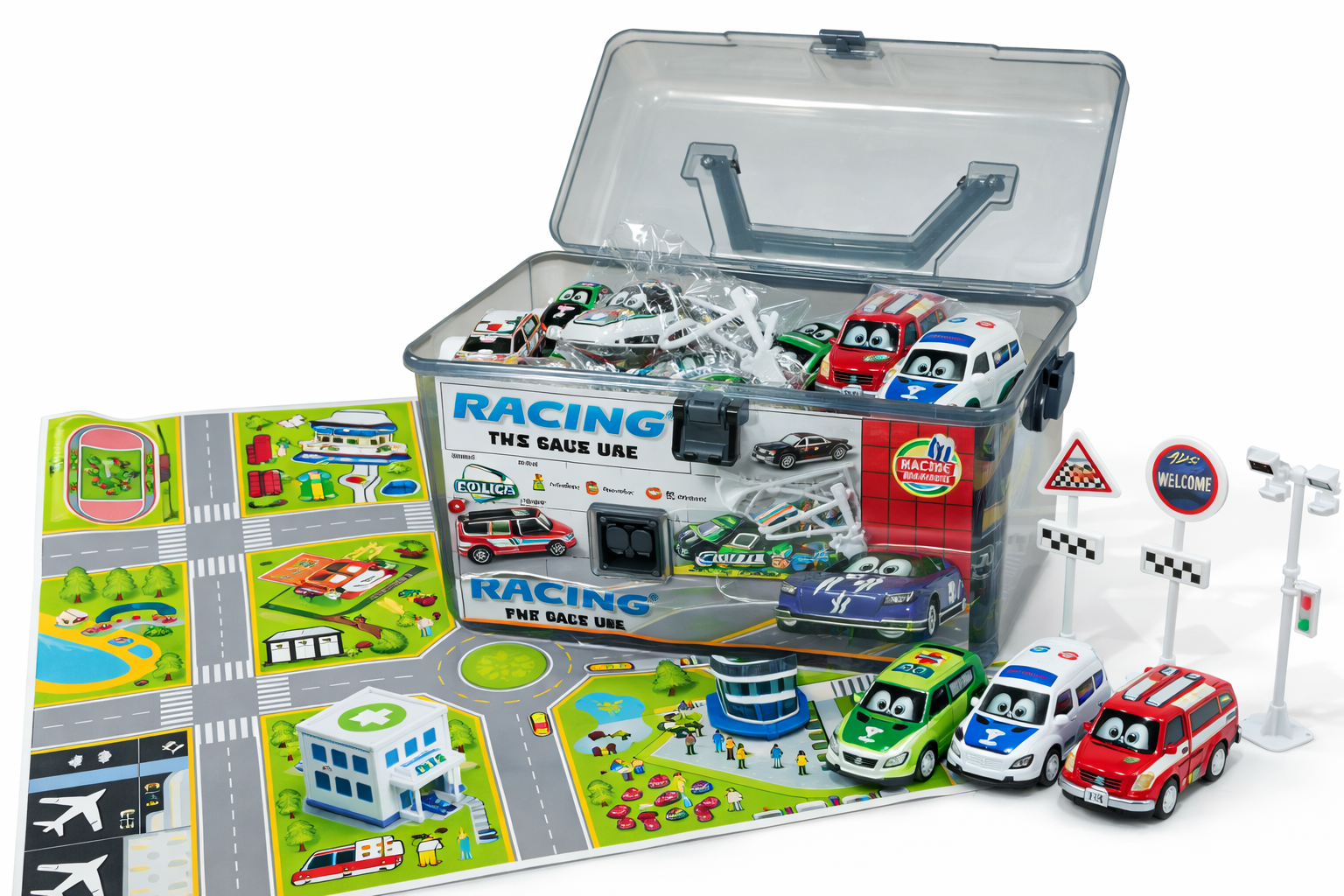 Model został zaprojektowany tak, aby zapewnić dziecku dużo możliwości zabawy od razu po otwarciu opakowania. W środku znajdują się różnorodne pojazdy, mata z ulicami oraz dodatki, które pozwalają stworzyć własne miasto i organizować ruch drogowy.