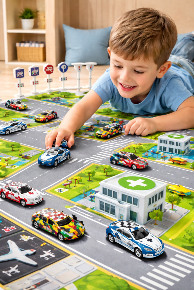 Zestaw świetnie sprawdzi się jako samochodziki do zabawy w domu, w podróży i podczas spotkań z rodzeństwem lub rówieśnikami. Dzięki dołączonej macie z ulicami oraz akcesoriom dziecko może budować własne historie i rozwijać wyobraźnię bez potrzeby sięgania po ekran.